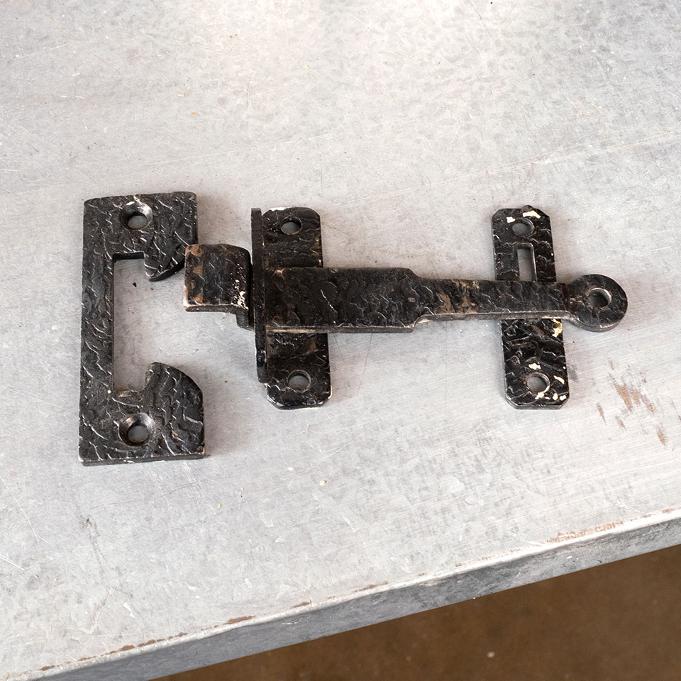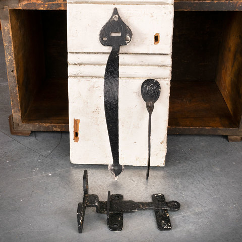 Vintage architectural salvage 5-piece interior metal finish reversible thumb latch handle door hardware set for doors up to 1 1/4" thick. Sold in 5-piece sets. Priced at $20 per set. Condition may vary. 8 3/4" x 1 5/8" handle