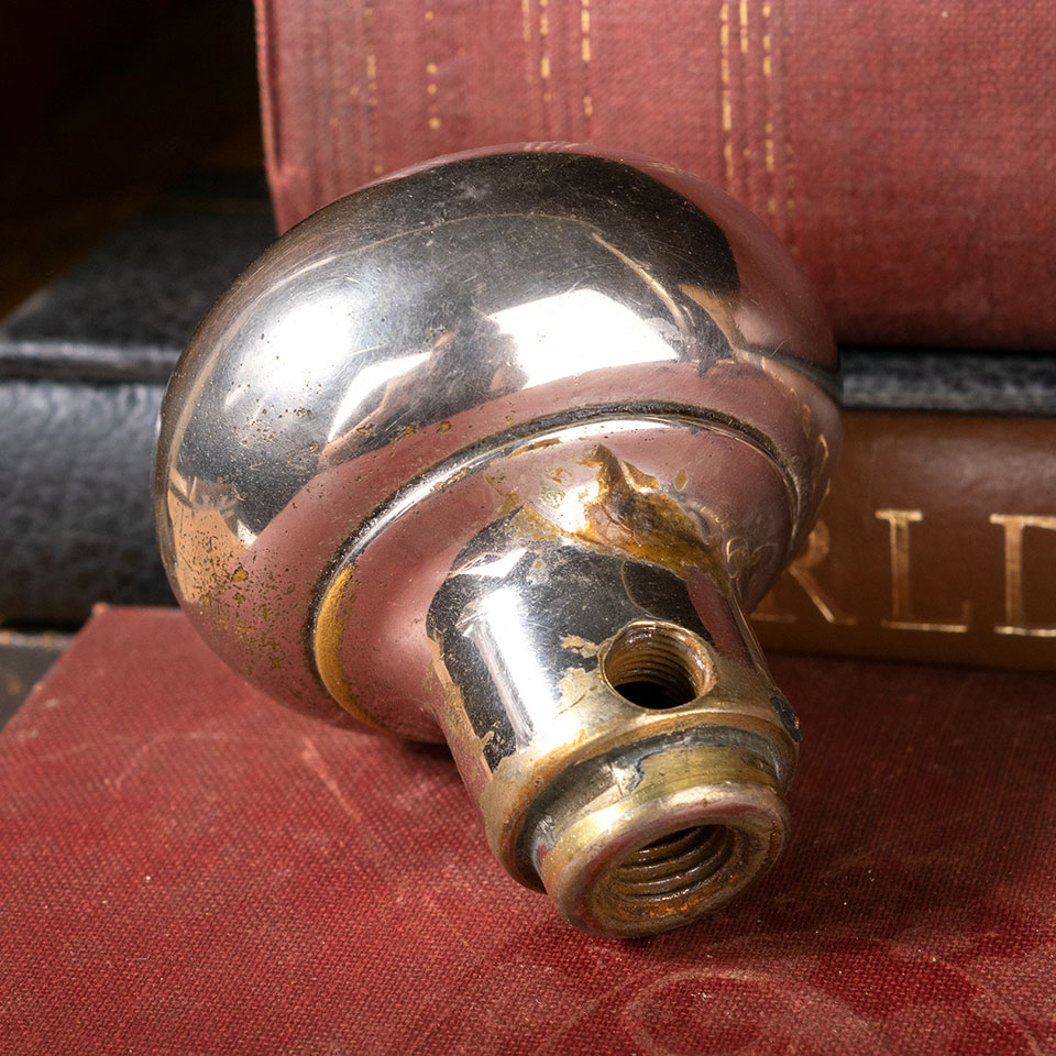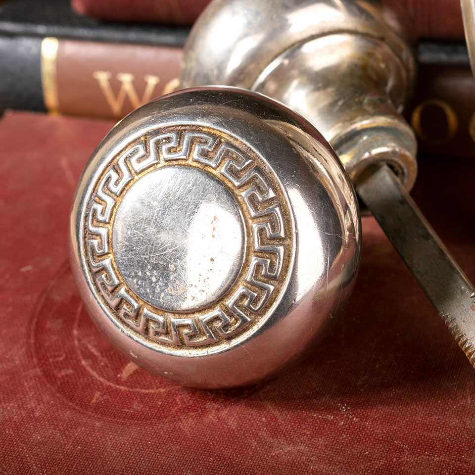 Antique architectural salvage chrome plated brass c. 1939 Barrows Hardware Eastlake pattern door hardware set including a pair of 2" diameter Greek key doorknobs with threaded spindle and set screws, 2 matching backplates each measuring 1 13/16" x 7 3/16", and a mortise latch with 7/8" x 5 1/4" face and 9/16" x 3 1/16" square body. Sold in sets. Priced at $140 per set. Condition may vary.