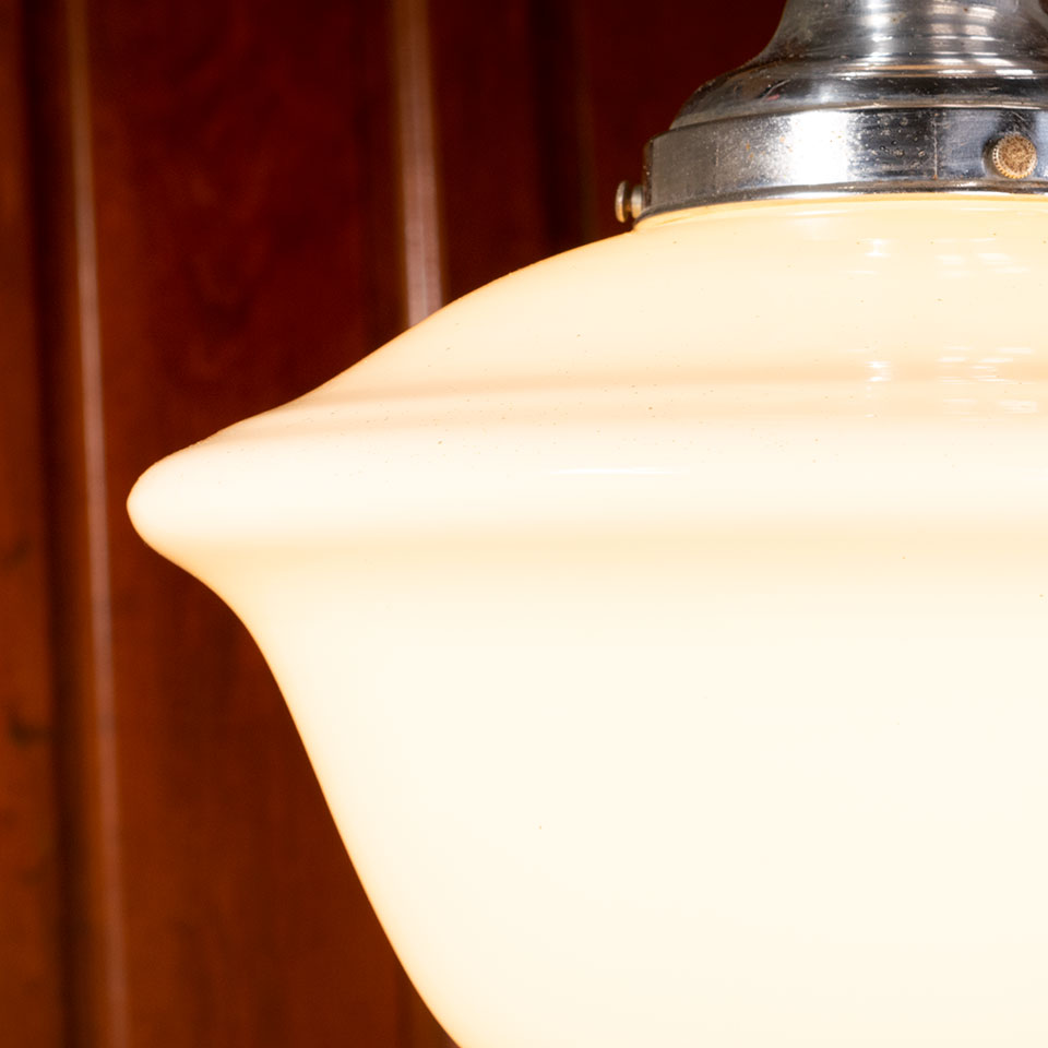 Antique architectural salvage flush mount schoolhouse ceiling light fixture with milk glass shade and chrome fitter with canopy measuring approximately 12" in diameter x 12" tall overall. Salvaged lighting should be tested by an electrician prior to installation.