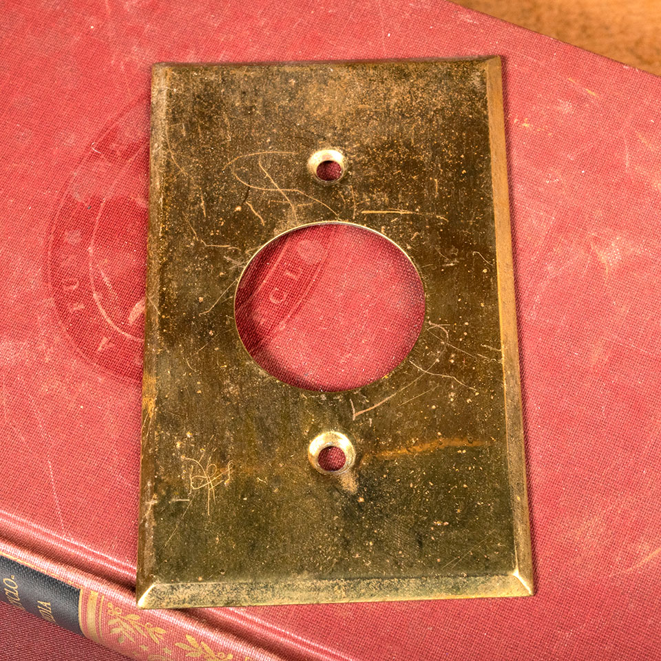 Vintage antique architectural salvage brass single gang receptacle electrical outlet cover plate.