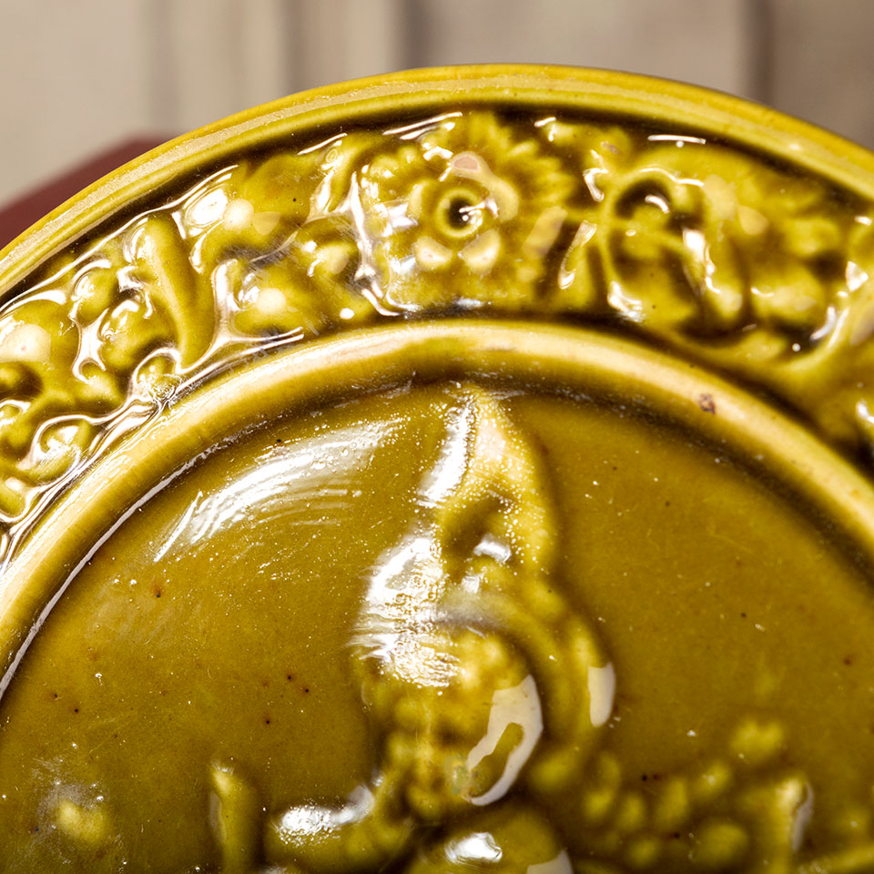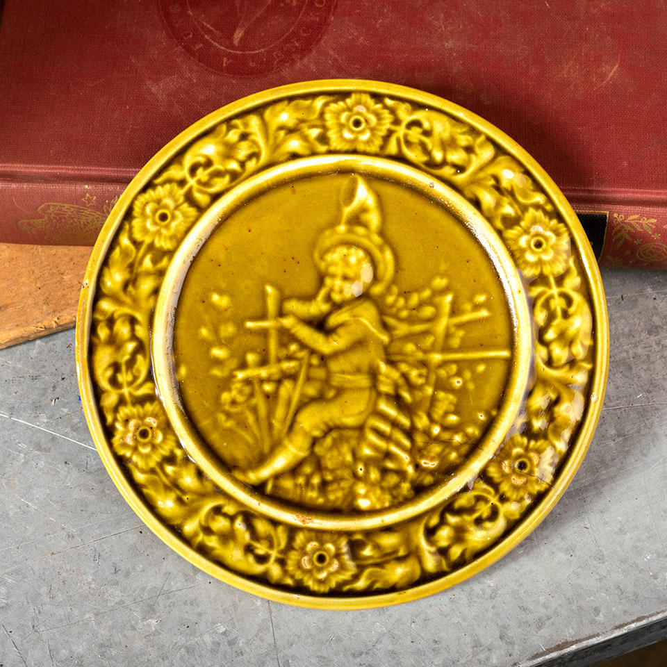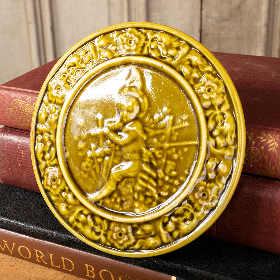 Small antique Majolica pottery brown and yellow round trivet plate featuring a boy with butterfly net. Small repair on back side. See photos to evaluate condition. Measurements: 5 1/2" diameter