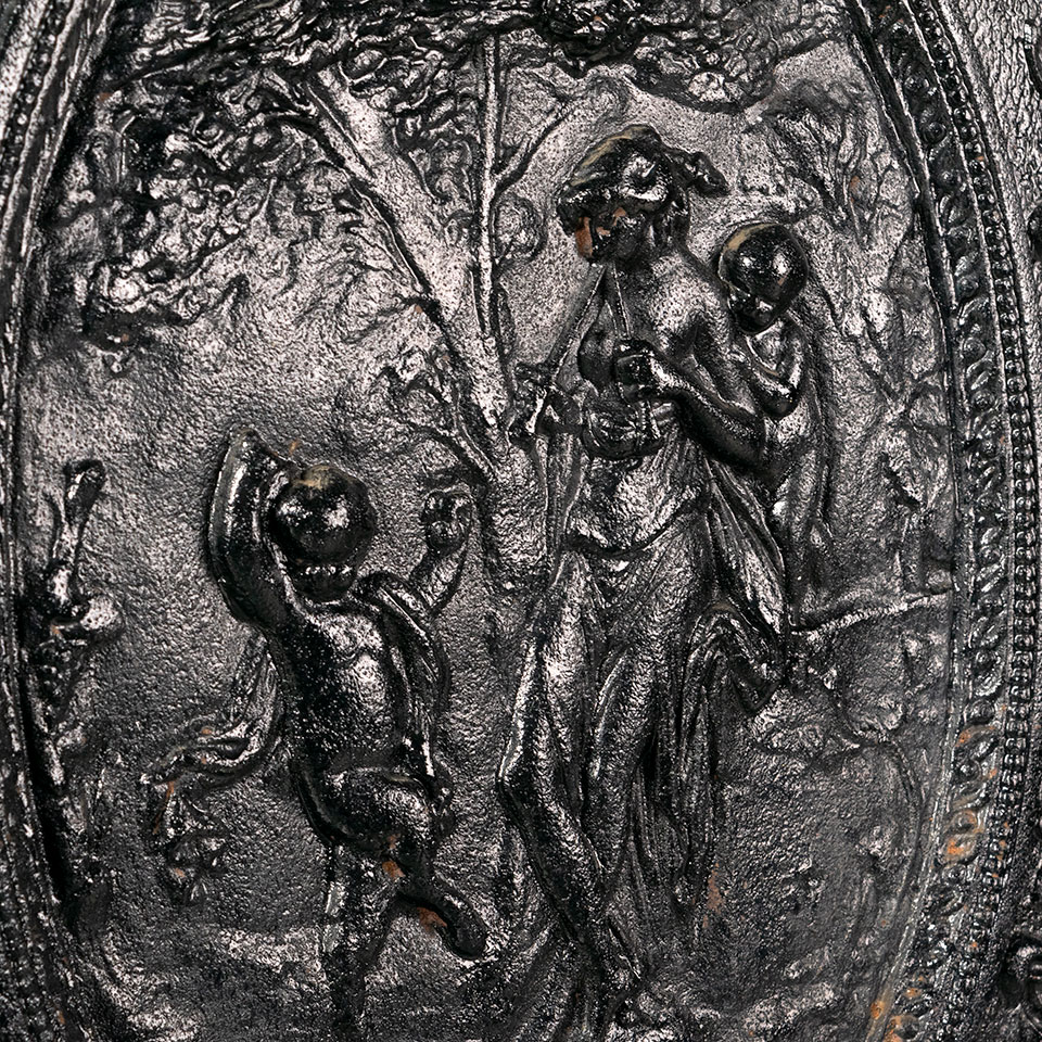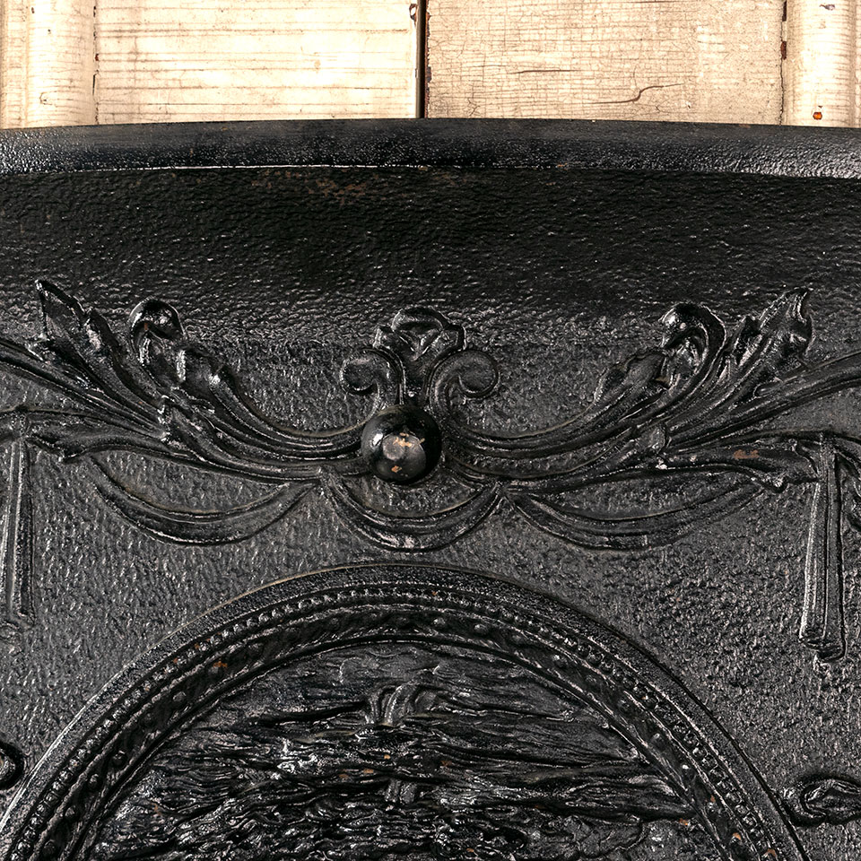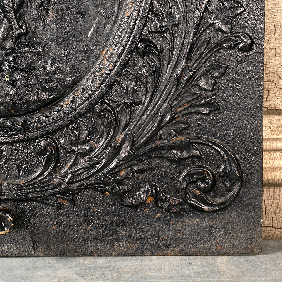 Architectural salvage antique high relief cast iron fireplace summer front cover with figural motif measuring approx. 20" wide x 26 1/2" tall x 1 3/4" front to back. See photos to evaluate condition.