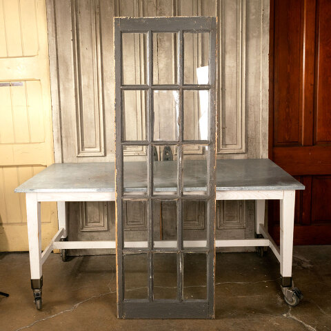 Large antique architectural salvage divided lite wood window sash with 15 glass panes measuring approximately 24 1/2" wide x 73 15/16" tall x 1 3/8" thick. Note there are 2 damaged panes. See photos to evaluate condition.