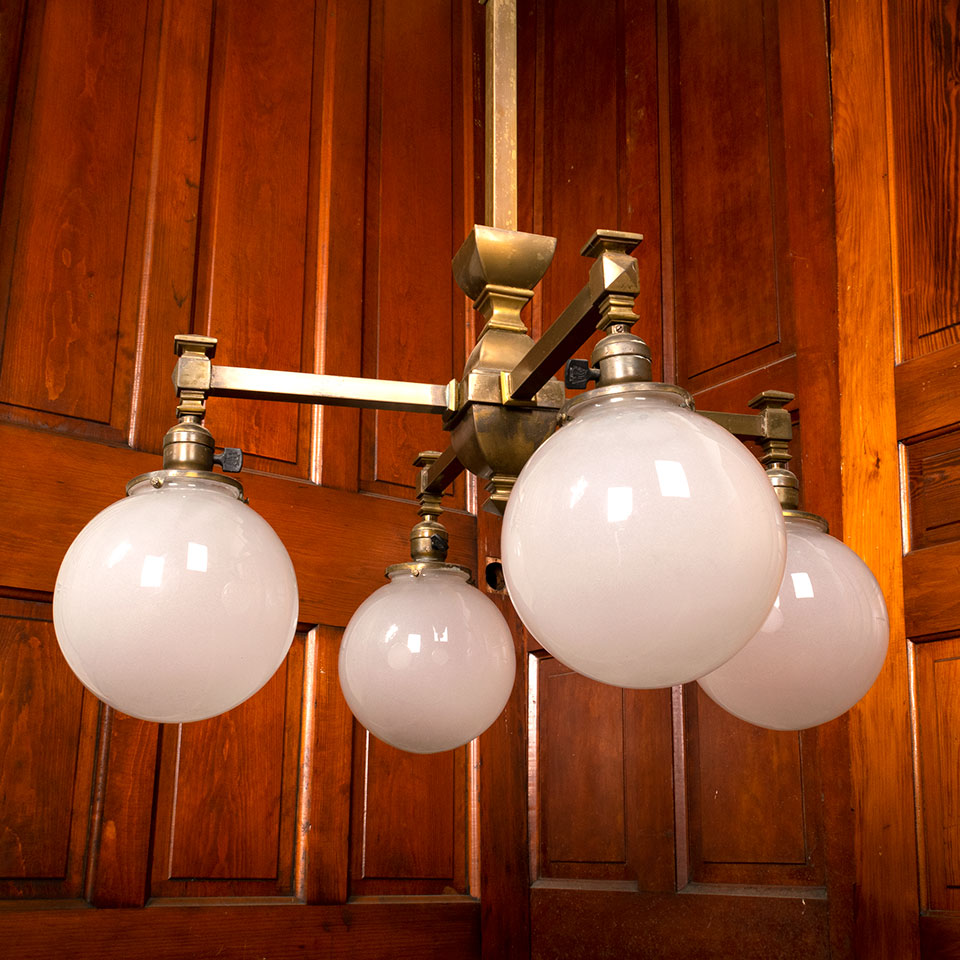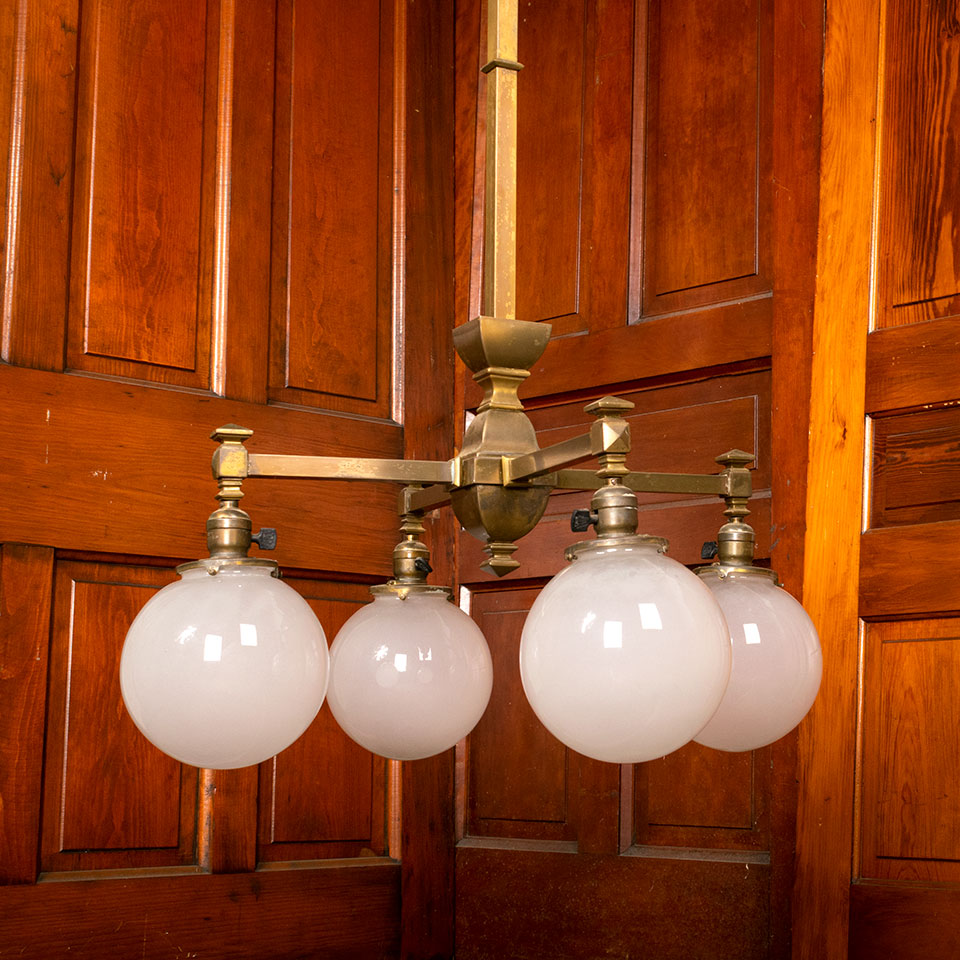 Antique architectural salvage 4 light chandelier measuring approx. 27" in diameter x 48" tall. This fixture will need to be rewired.