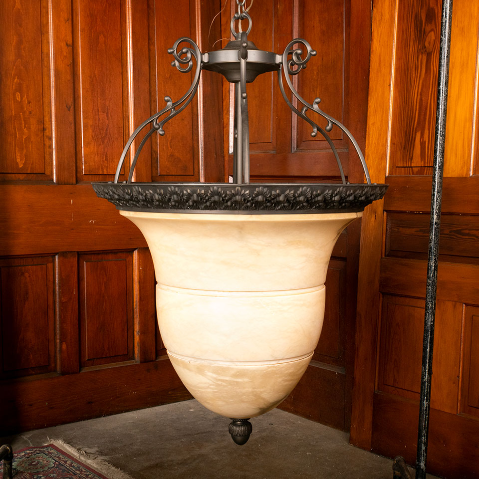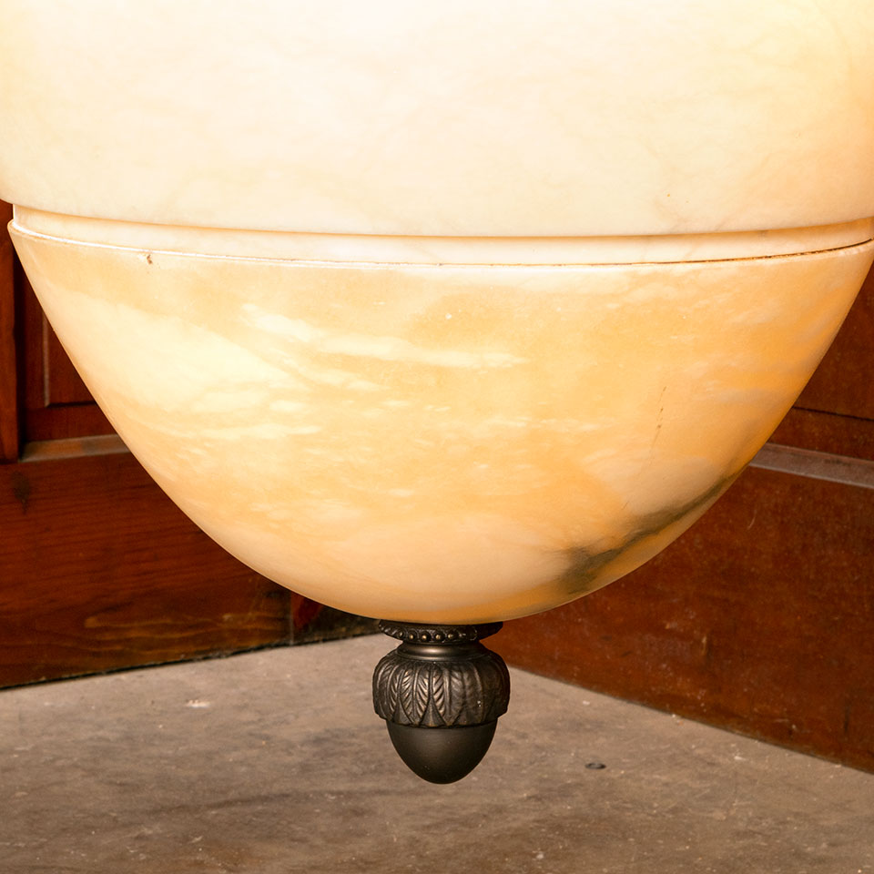 Architectural salvage contemporary bronze chandelier with large alabaster globe measuring approx. 30" in diameter x 44" tall (not including the chain or ceiling canopy. The ceiling canopy measures 9" in diameter. See photos to evaluate condition.