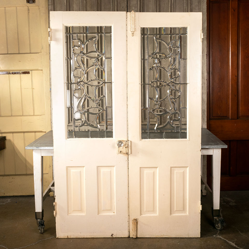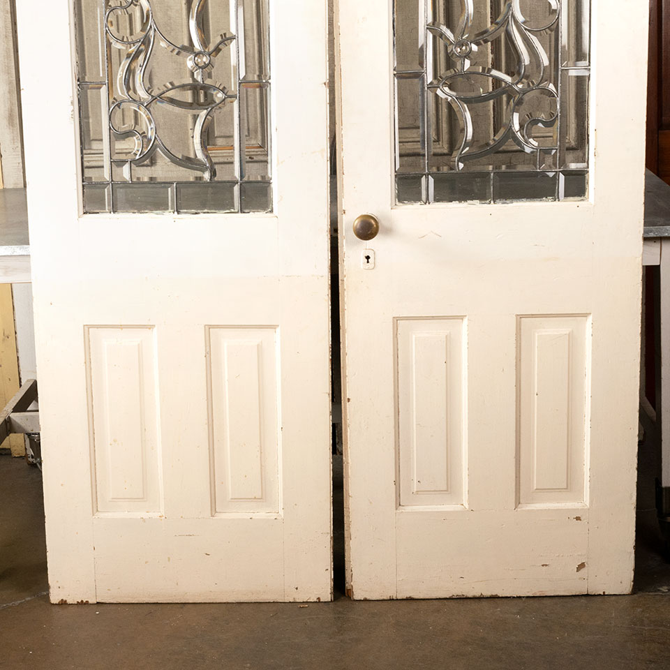 Antique architectural salvage ornate leaded glass entry doors together measuring approximately 51 7/8" wide x 79 1/2" tall x 1 3/8" thick. The hardware on the door comes AS IS. There is one broken facet. See photos to evaluate condition.