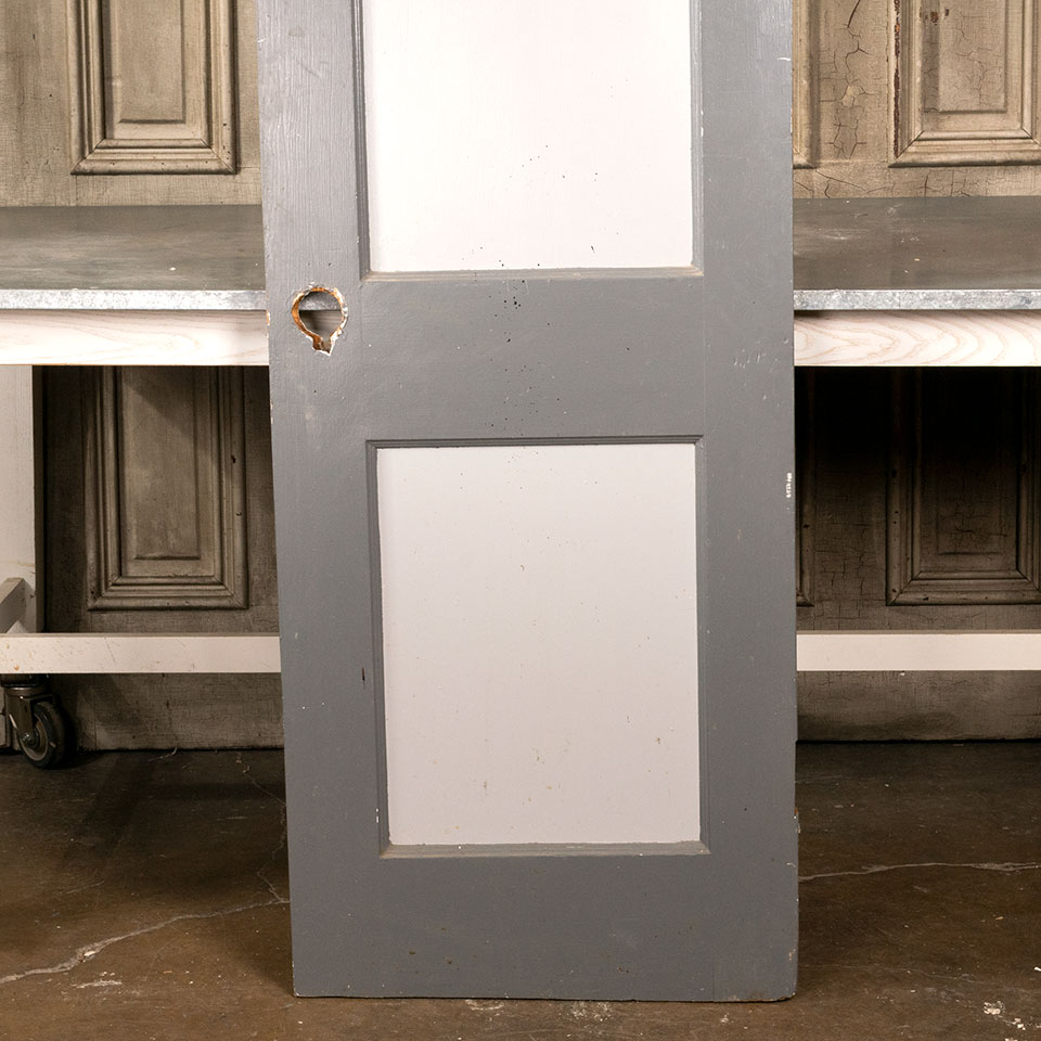 Antique architectural salvage 2 panel painted wood interior door measuring approximately 23 3/4" wide x 77 5/8" tall x 1 3/8" thick. See photos to evaluate condition.