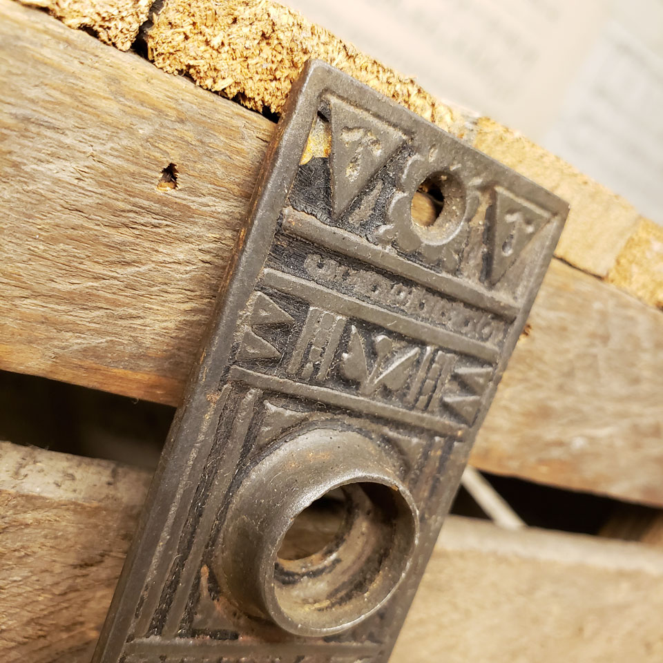 Antique architectural salvage cast iron Britten Graham & Mathes Lotus pattern doorknob backplate c. 1890 (approx. 1 1/2" x 5 1/2" with a 3/4" diameter collar). Color and condition vary, see photos to evaluate. Priced at $28/each.