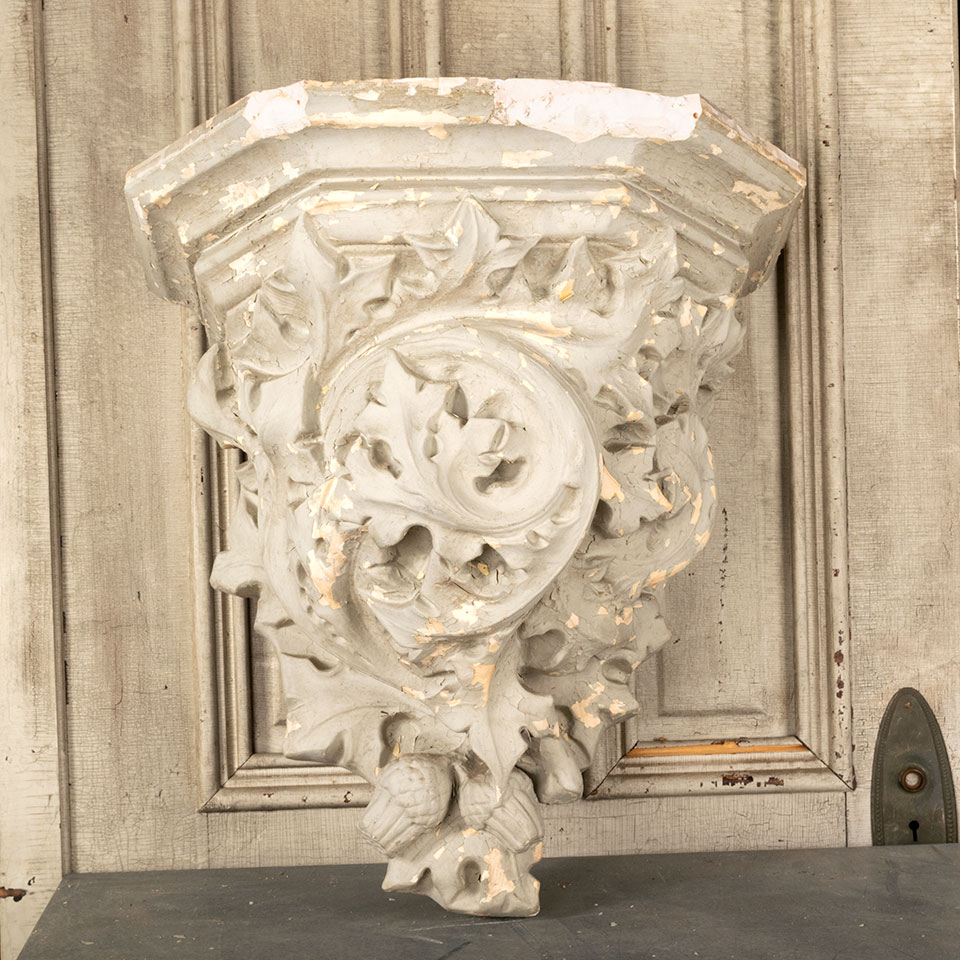Antique architectural salvage cast plaster architectural ornament measuring approx. 22 1/4" wide x 24" tall x 16 1/2" front to back. There is some plaster loss along the front edge of the piece. See photos to evaluate condition.