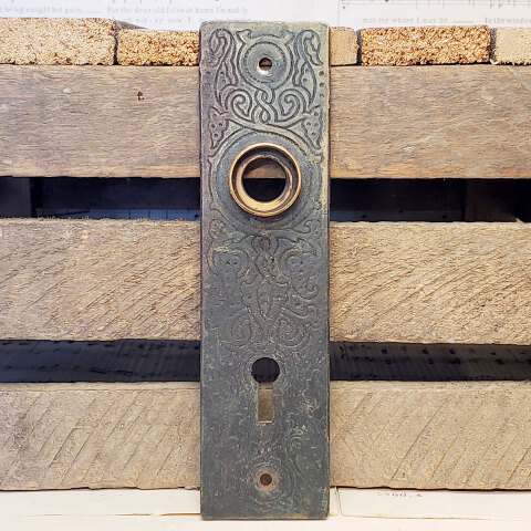 Antique architectural salvage cast iron Russell & Erwin Villa pattern circa 1890 (approx. 1 1/2" x 5 5/8" with a 3/4" diameter brass collar). The spindle & keyholes measure 2 1/2" on center. Color and condition vary - see photos to evaluate condition. Priced at $28 each.