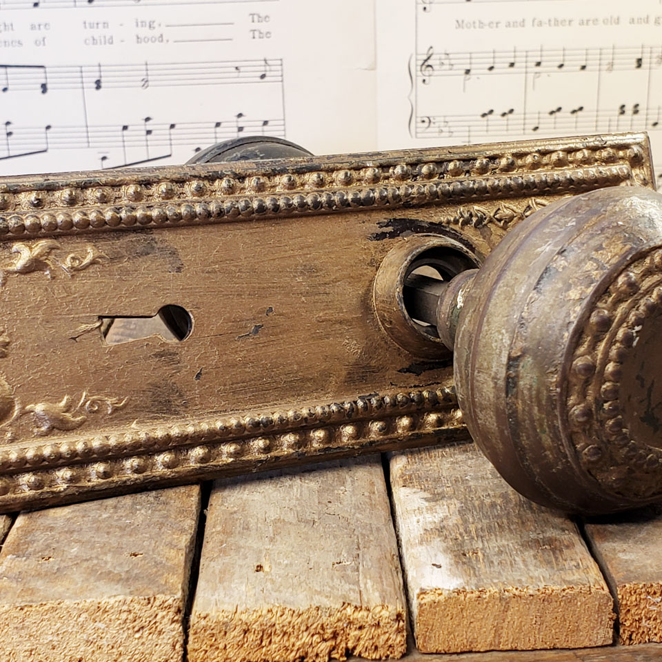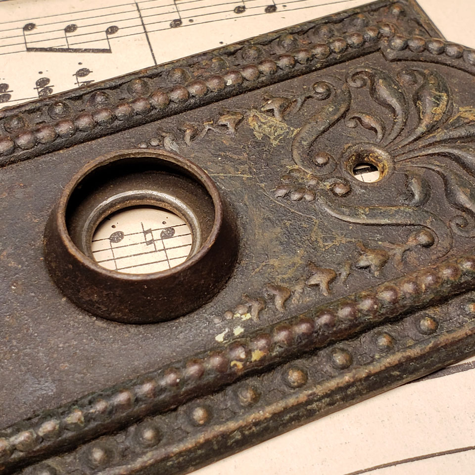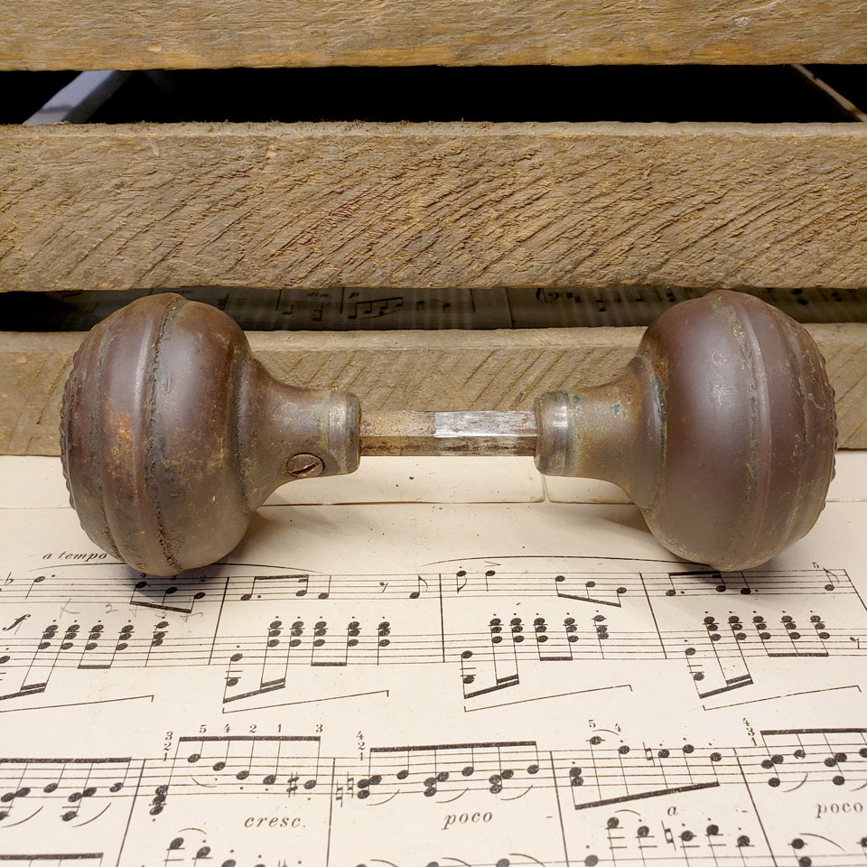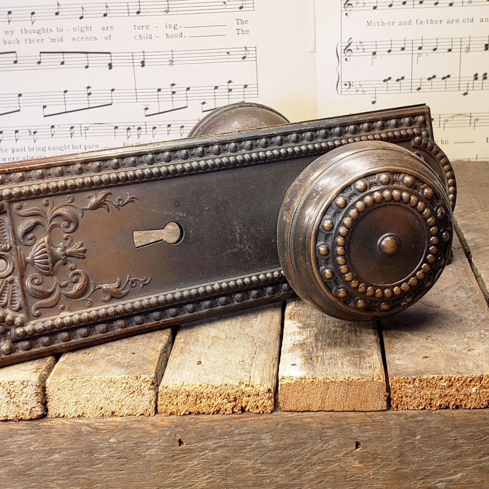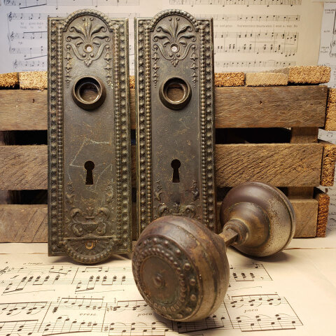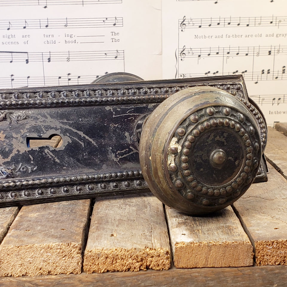 Antique architectural salvage Corbin Como pattern steel interior door hardware set circa 1905 including a pair of 2 1/4" diameter doorknobs with tapped spindle and set screws and a pair of 2 1/2" wide x 7 3/4" tall backplates. Sold in sets. Priced at $125 per set. Color and condition may vary. See photos to evaluate.