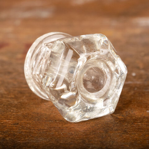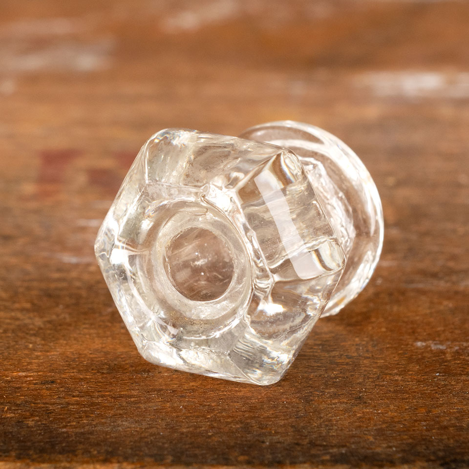 Antique architectural salvage clear pressed glass hexagonal furniture drawer / cabinet door knob measuring approx. 1" in diameter x 1" front to back with a round shaped base. There's no mounting hardware with these knobs. See photos to evaluate condition. Priced at $8/each.
