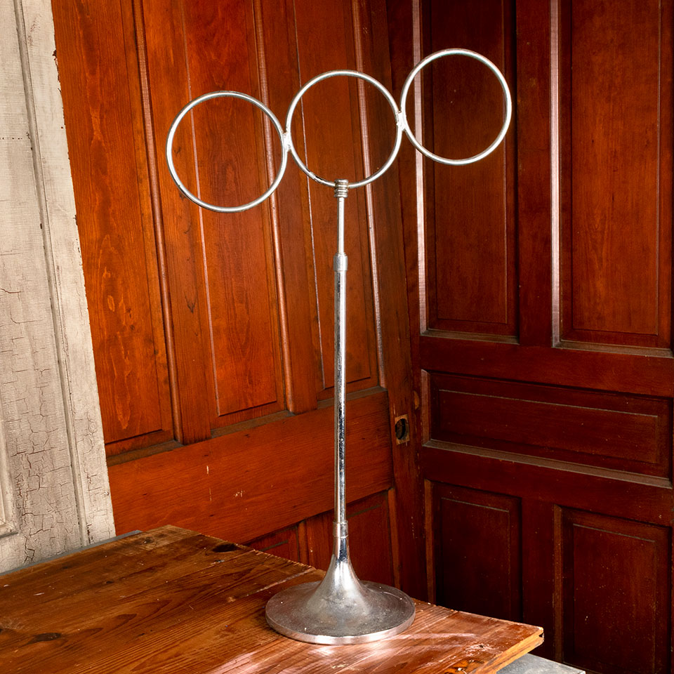 Antique chrome clothes store adjustable countertop necktie or scarf display rack measuring approx. 17 1/2" wide x 27"-34 1/2" tall with an 8" diameter base. See photos to evaluate condition.