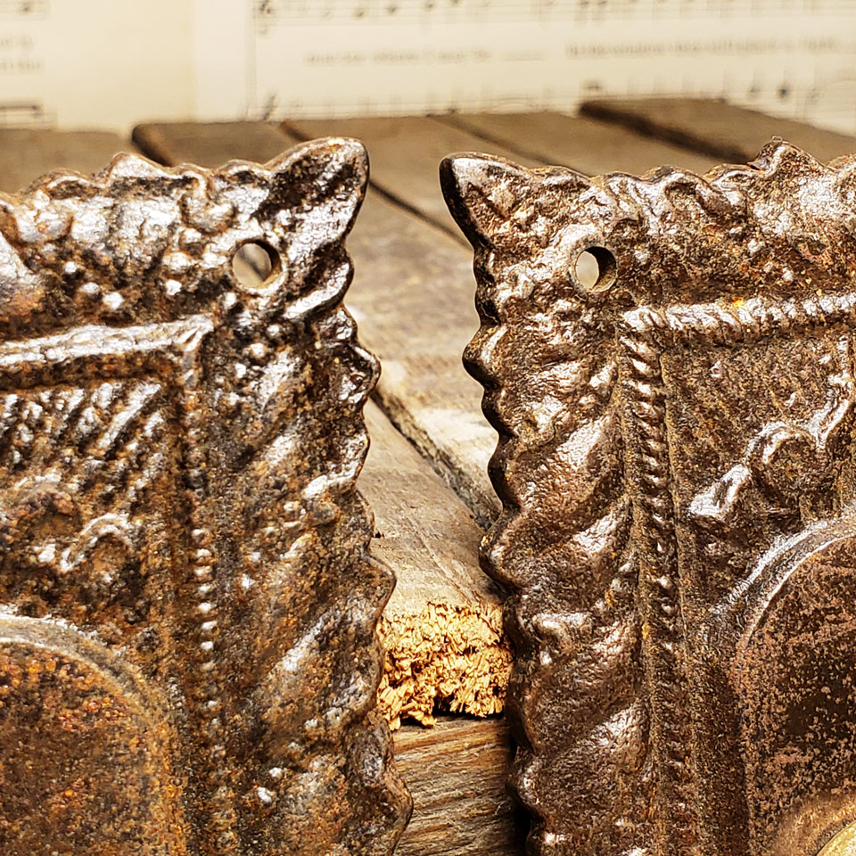 Antique architectural salvage cast iron and brass Norwich Lock Company interior door hardware set circa 1892 including a pair of 2 1/4" diameter doorknobs with tapped spindle and set screws and a pair of 2 3/8" x 7" backplates. Sold as a set. Priced at $195 for the set.