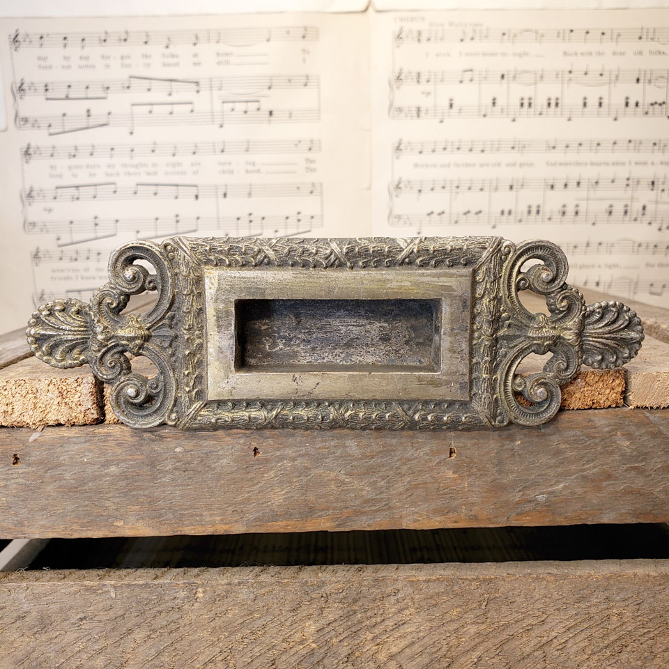 Antique architectural salvage cast bronze Chicago Hardware Co. recessed window sash lift hardware measuring approx. 6 3/8" wide x 2 1/8" tall x 5/8" front to back. Recessed area measures 2 1/4" x 7/8". Sold individually. Condition may vary. Priced at $45/each.