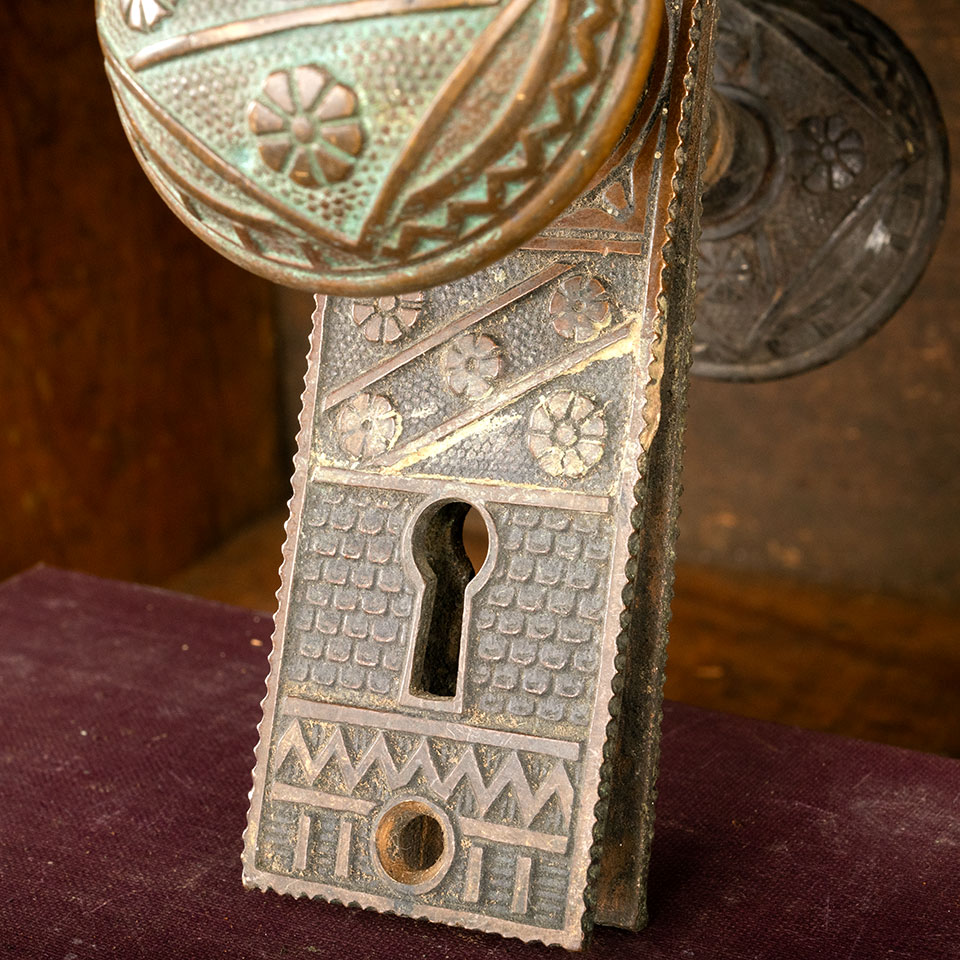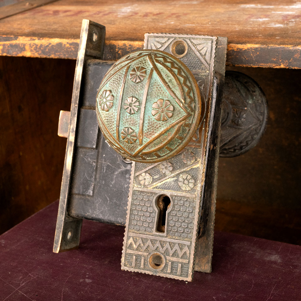Antique architectural salvage cast bronze F. C. Linde (circa 1885) Victorian door hardware set. The set includes 2 doorknobs (2 1/4" in diameter), a tapped spindle with set screws, 2 backplates (1 5/8" wide x 5 1/8" tall), and a mortise lock (face plate 1" wide x 5 1/4" tall & body 3 1/4" front to back). See photos to evaluate condition. Sold as a set. Priced at $225 for the set.