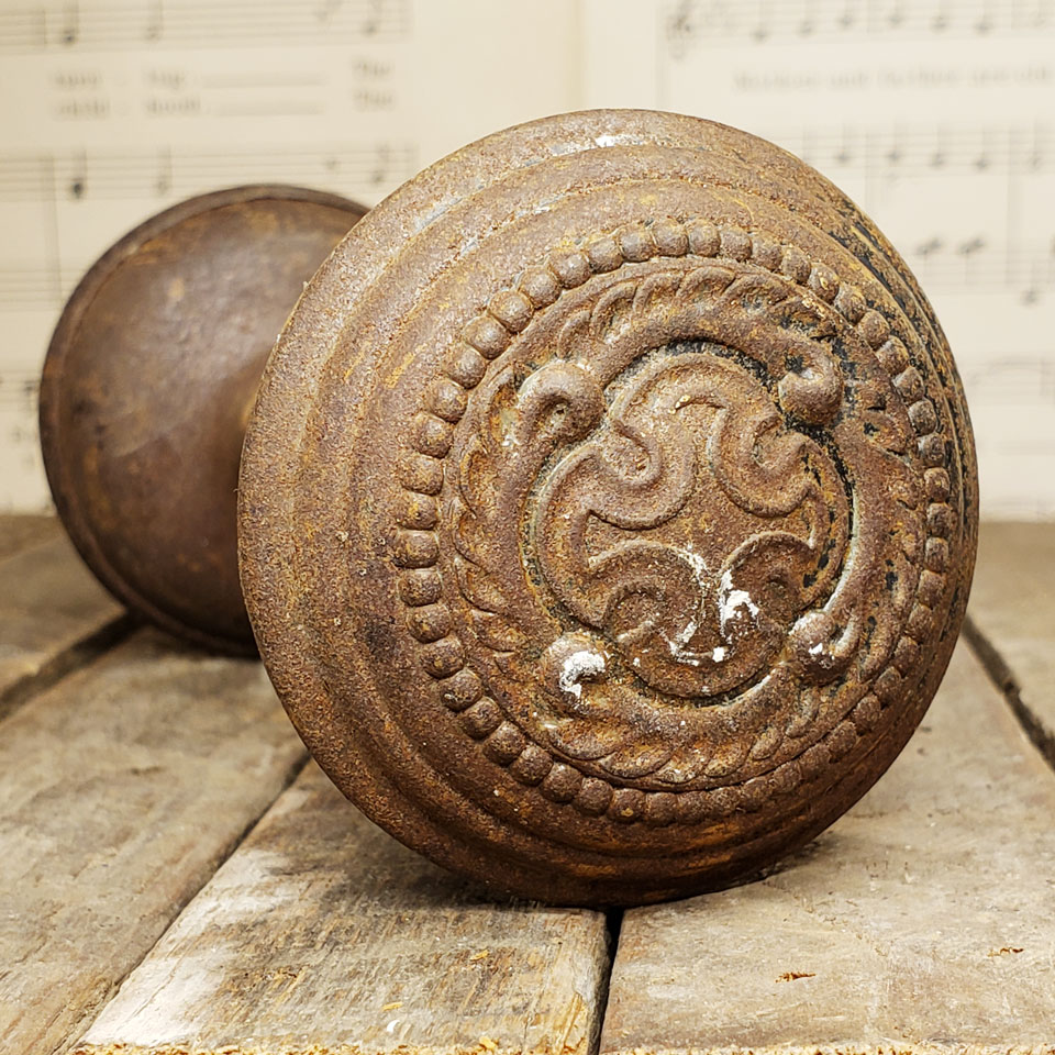 Antique architectural salvage steel Russell & Erwin Warwick pattern doorknob set circa 1899 including a pair of 2 1/4" diameter knobs with 3/4" diameter stems, tapped spindle, and set screws. Sold in sets. Condition may vary. Priced at $95 per set.