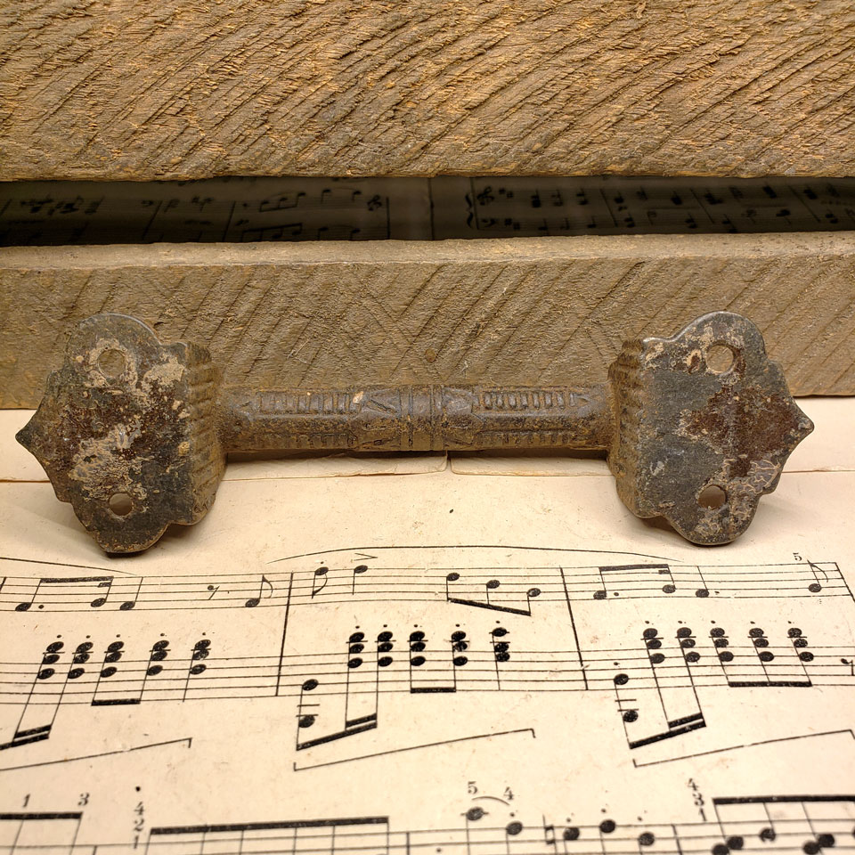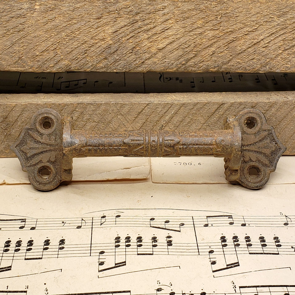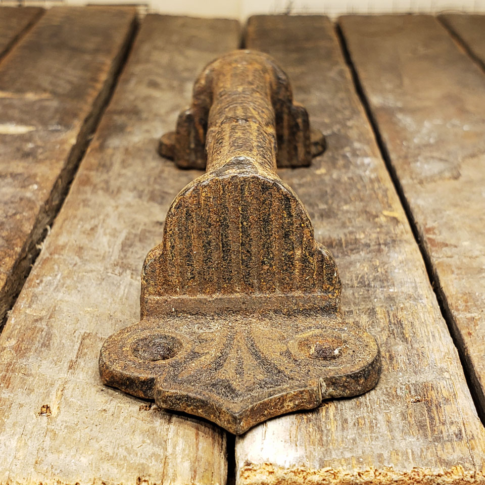 Antique architectural salvage cast iron Victorian Eastlake patterned window sash lift or drawer pull handle each measuring approx. 5 1/8" x 1 1/2" x 1" overall. Sold individually. Color and condition may vary. Priced at $45 each.