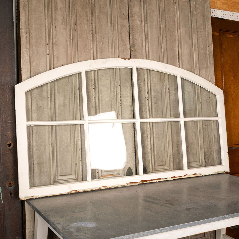 Antique architectural salvage arched top school classroom divided 8 lite transom window with original wavy glass measuring approx. 76 5/8" wide x 40 5/8" tall x 1 3/4" thick. See photos to evaluate condition.
