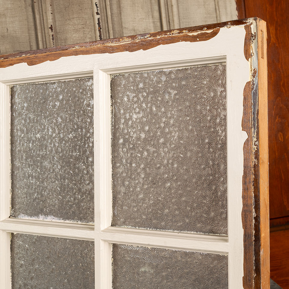 Antique architectural salvage divided 8 lite wood window sash with pressed privacy glass panes measuring approx. 43" wide x 27" tall x 1 3/8" thick. One of the panes of glass is cracked. See photos to evaluate condition.