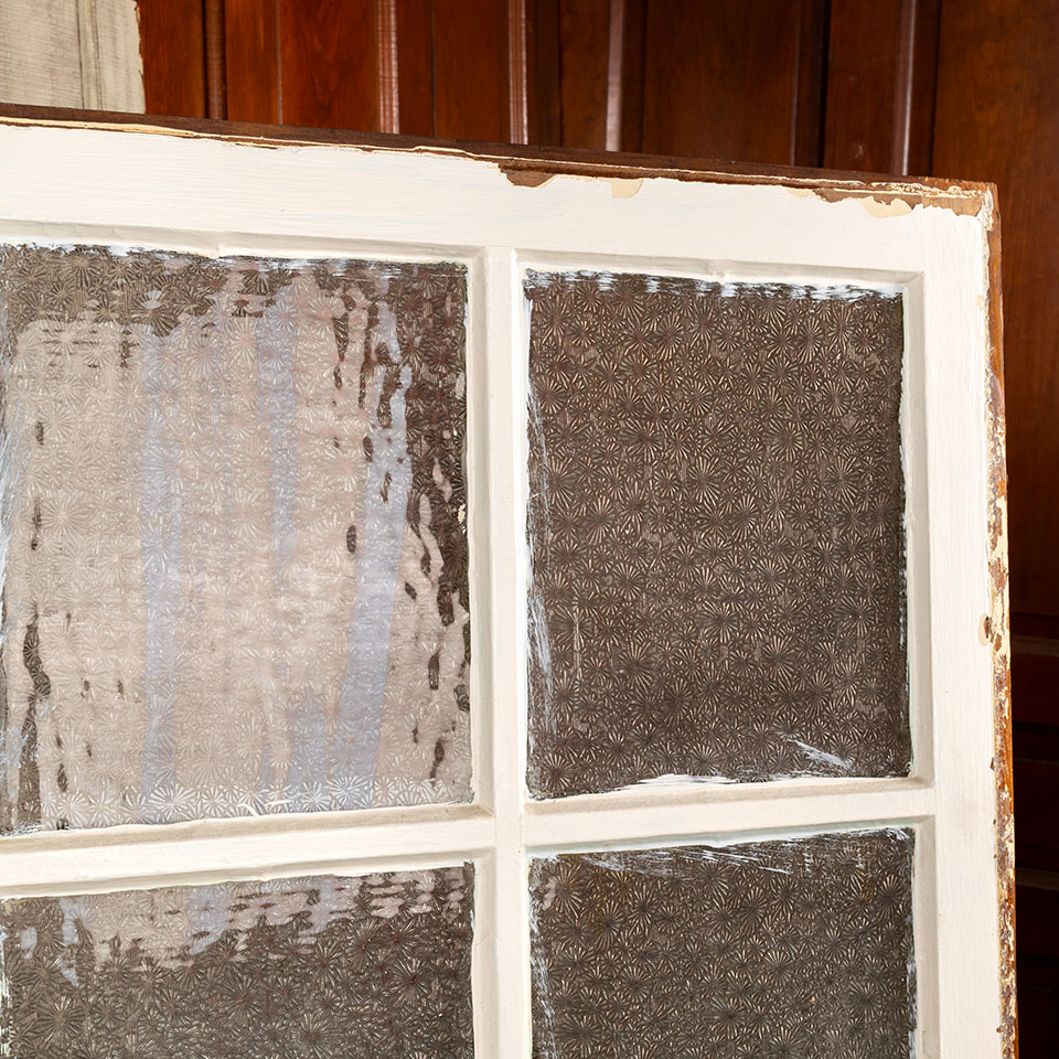 Antique architectural salvage divided 8 lite wood window sash with pressed privacy glass panes measuring approx. 43" wide x 27" tall x 1 3/8" thick. See photos to evaluate condition.