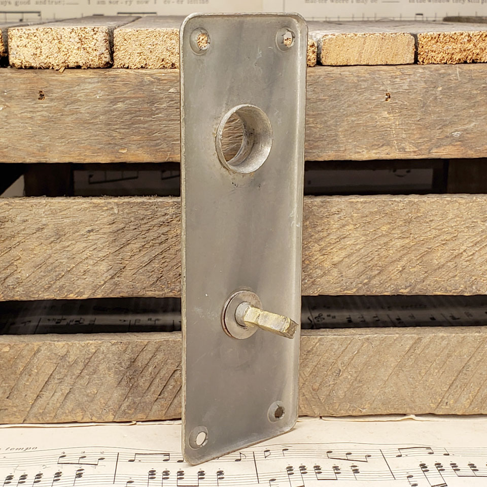 Antique architectural salvage nickel plated brass interior doorknob backplate with mortise latch deadbolt thumb turn measuring approximately 2" wide x 5 3/4" tall x 2" front to back with a 3/4" diameter collar. The thumb turn and spindle measure 2 1/2" on center.