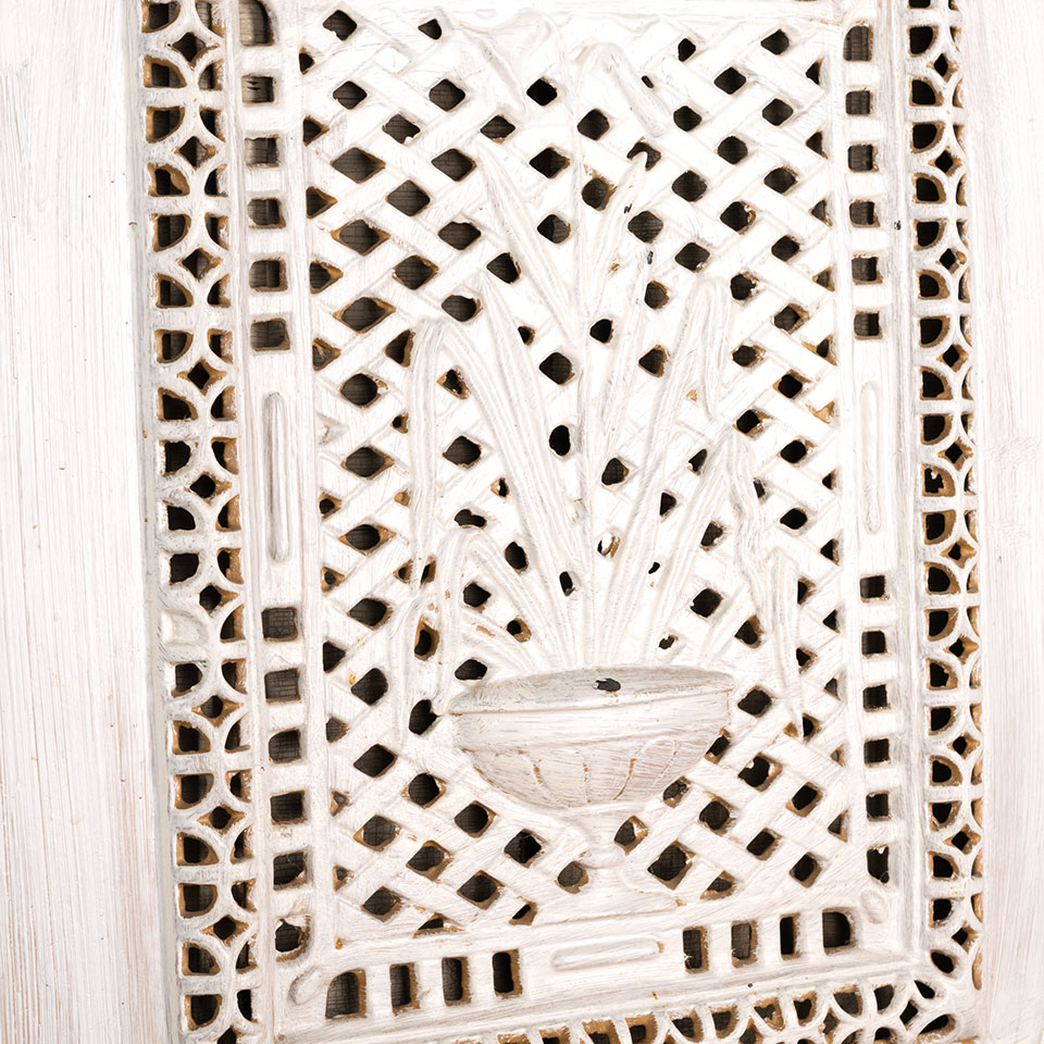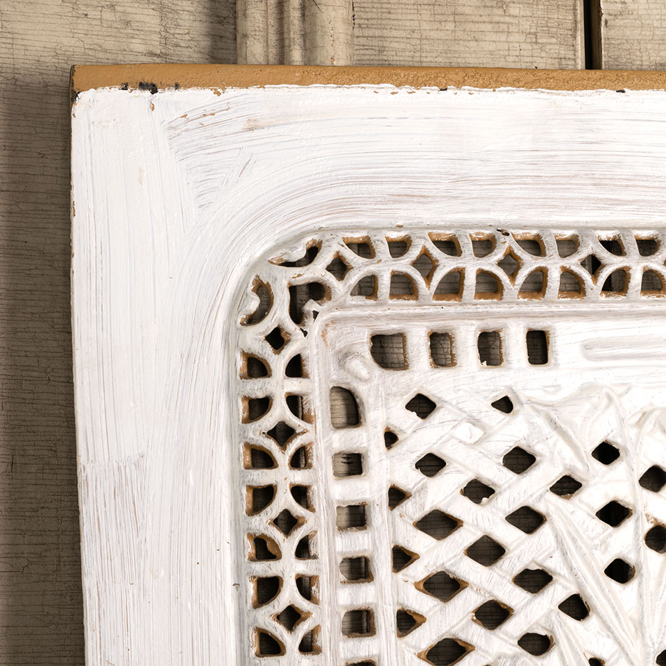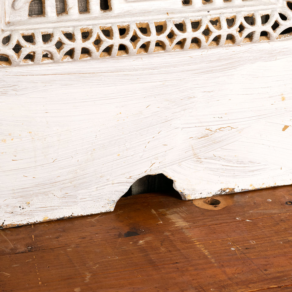 Antique architectural salvage ornate painted cast iron fireplace summer front cover with flower and urn in high relief measuring approx. 20" wide x 28 5/8" tall x 3/4" front to back. There's an arched cutout at the bottom of this piece. See photos to evaluate condition.