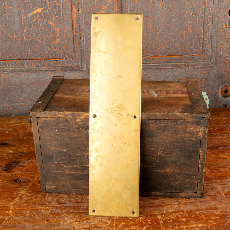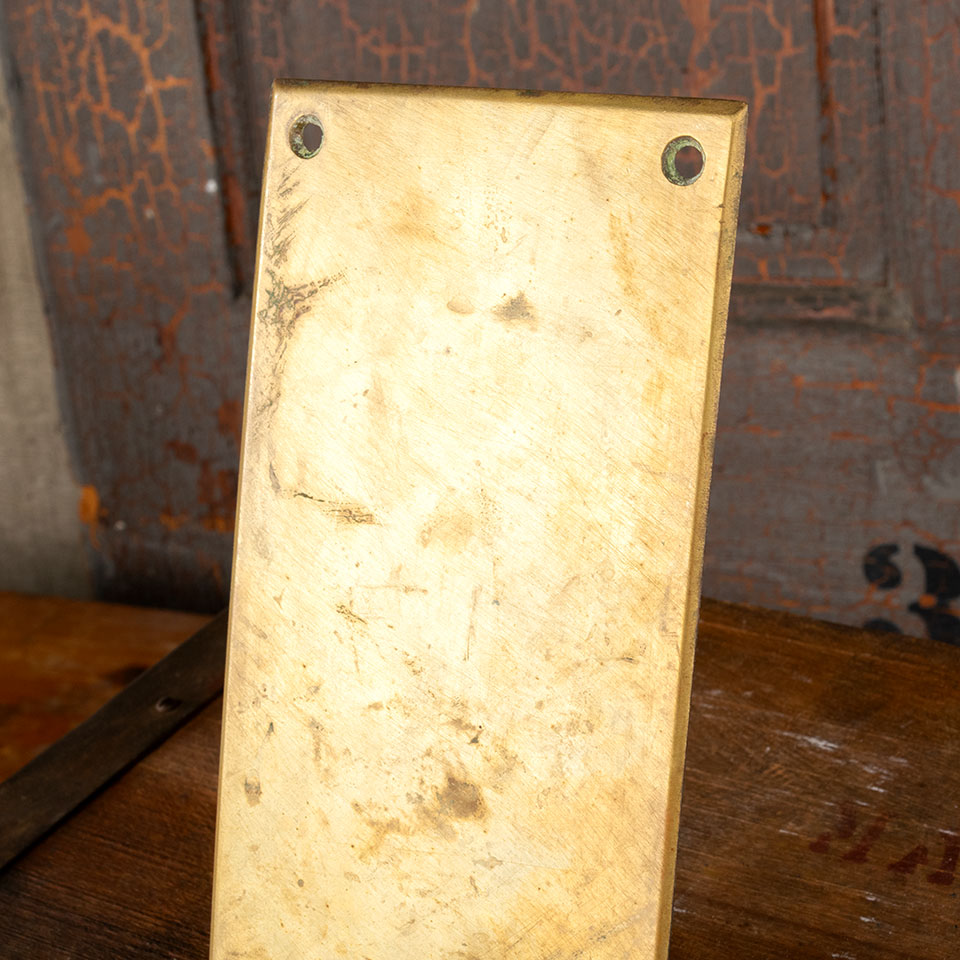Antique architectural salvage heavy brass Yale & Towne door push plate with beveled edges measuring approx. 4" x 16" and 1/16" thick. Color and condition may vary, see photos to evaluate. Priced at $75/each.