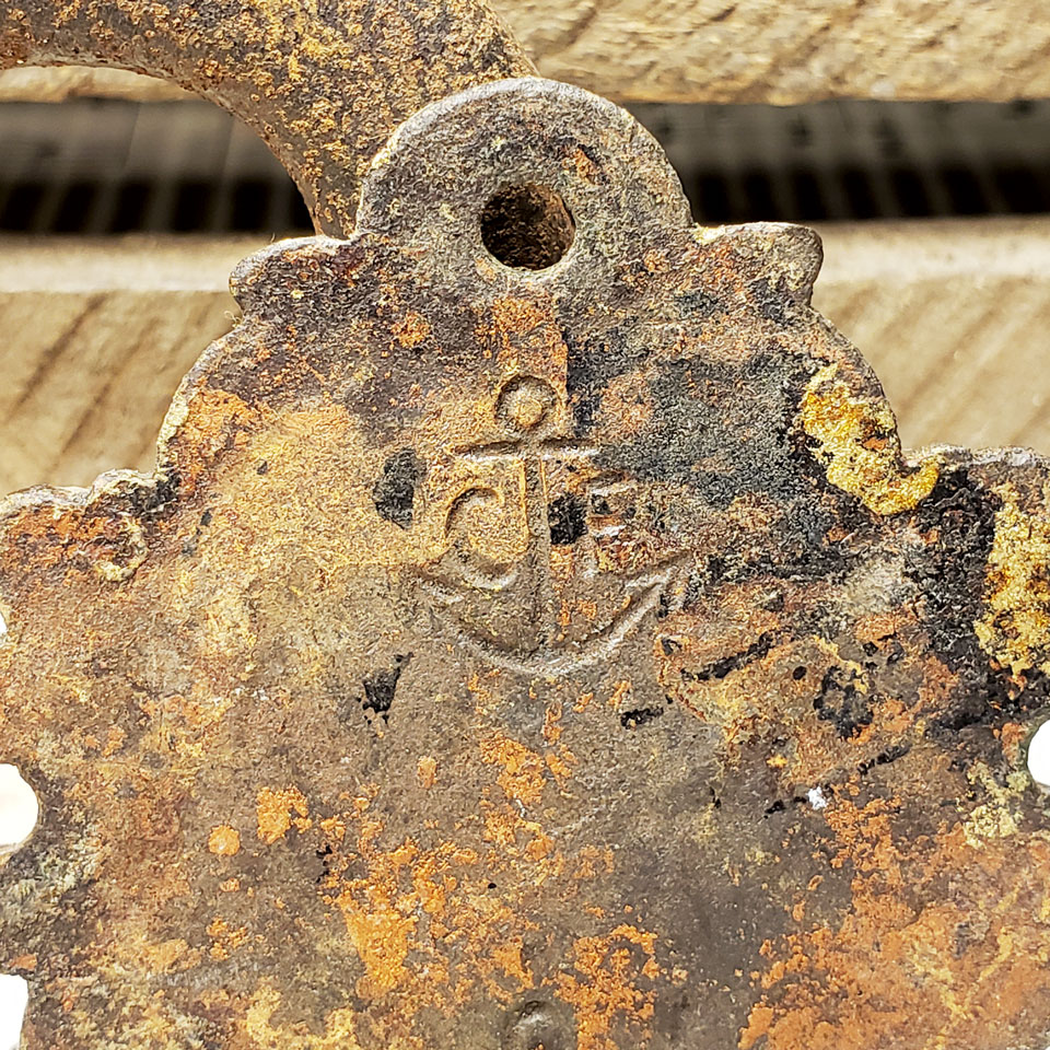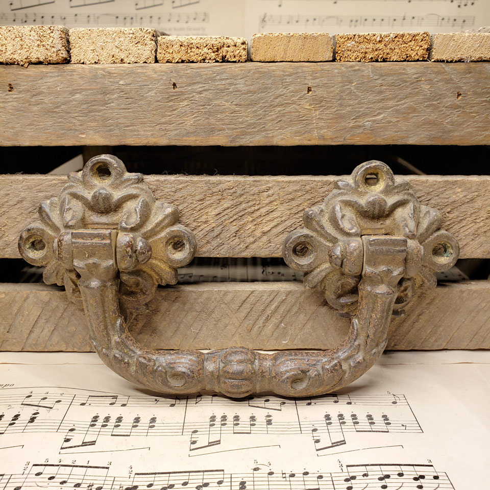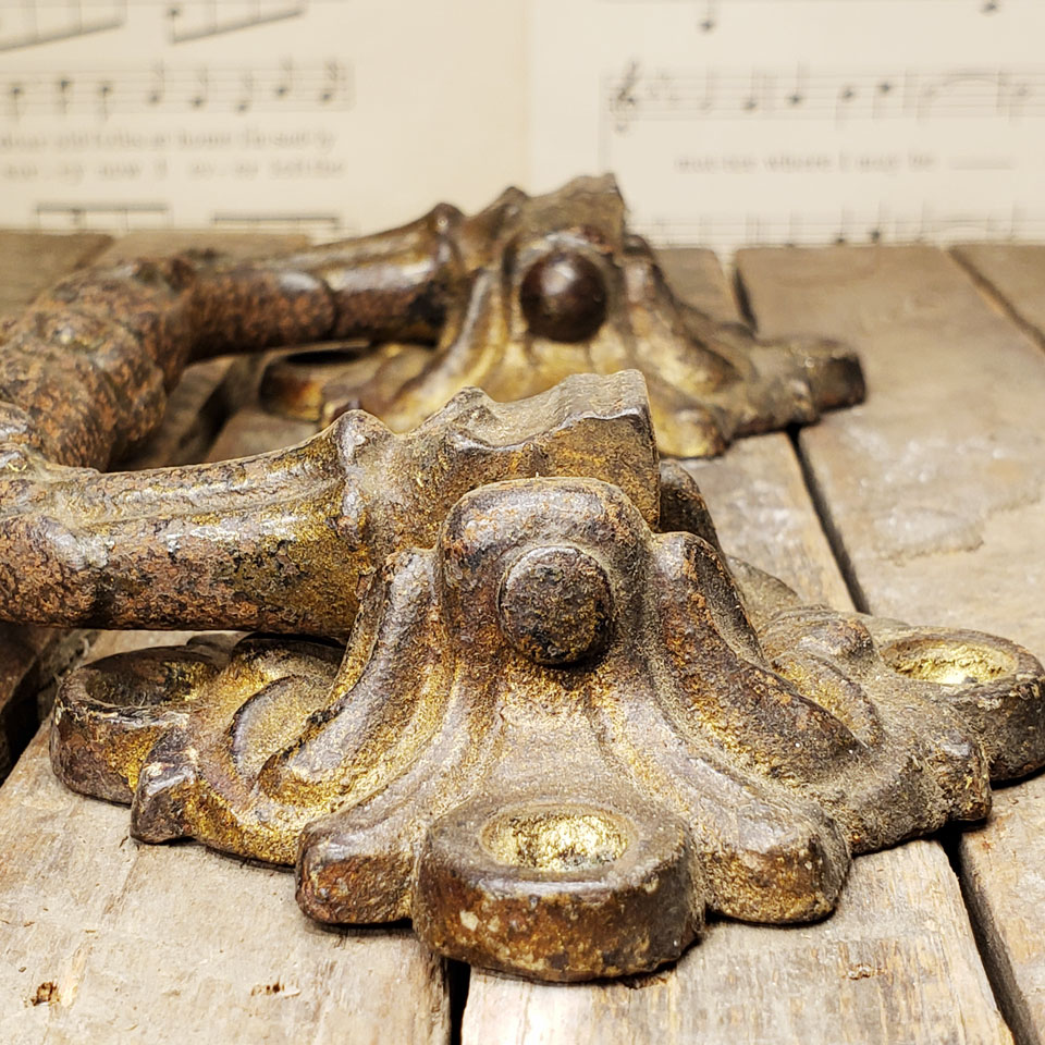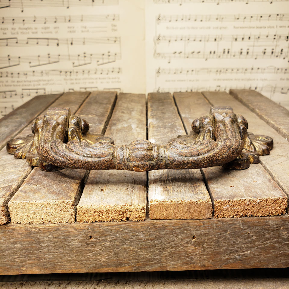 Large decorative antique architectural salvage cast iron furniture trunk drawer handle pull measuring 7 1/4" x 3 3/4" x 1 1/8" overall. Branded on back.