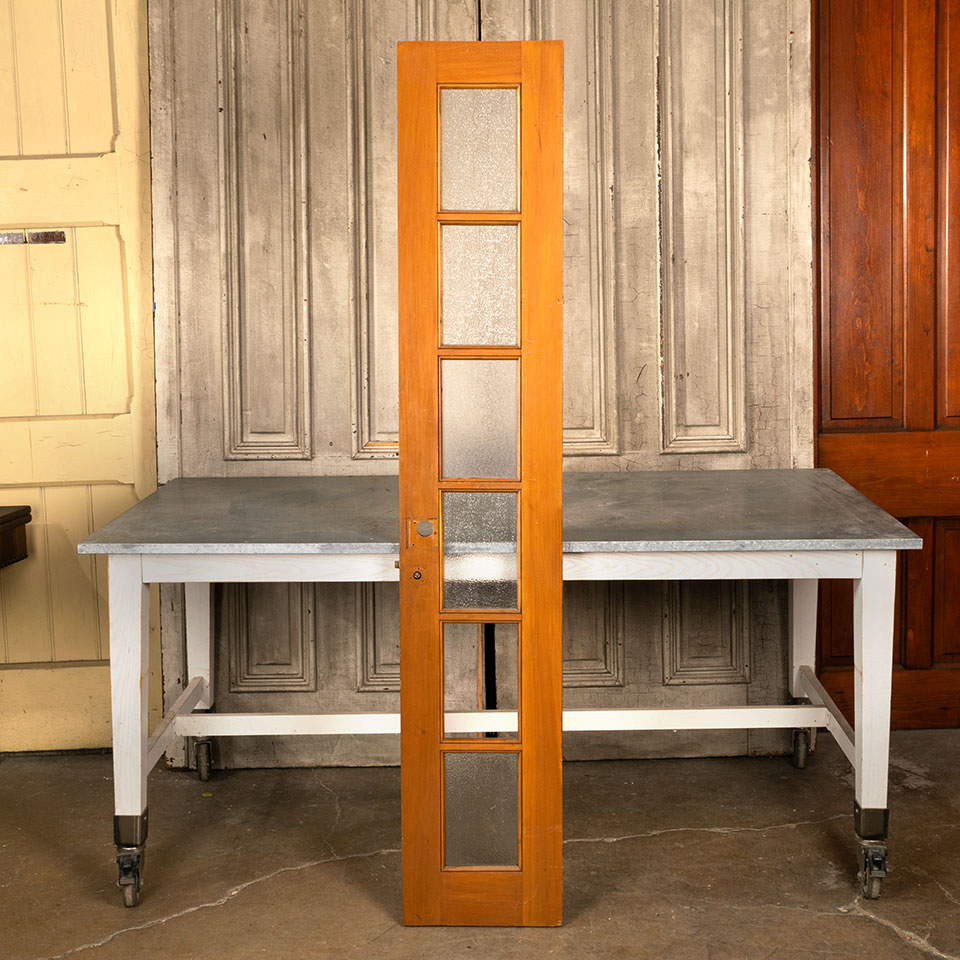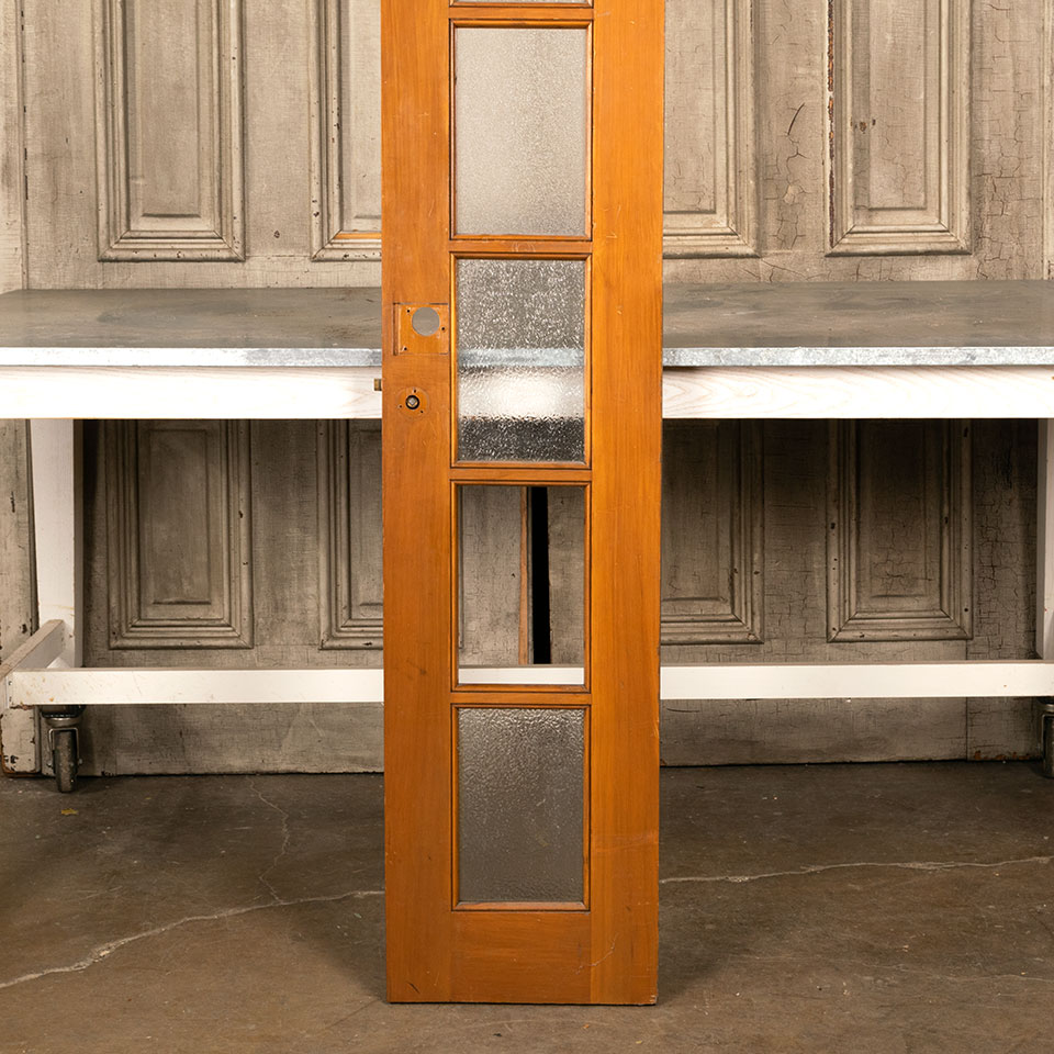 Vintage 6 lite wood school classroom closet/cabinet door with mortise lock and texture glass panels measuring approx. 13 7/8" wide x 74 3/4" tall x 1 1/4" thick. There's one missing pane of glass and another pane doesn't match the three original panes. See photos to evaluate condition.