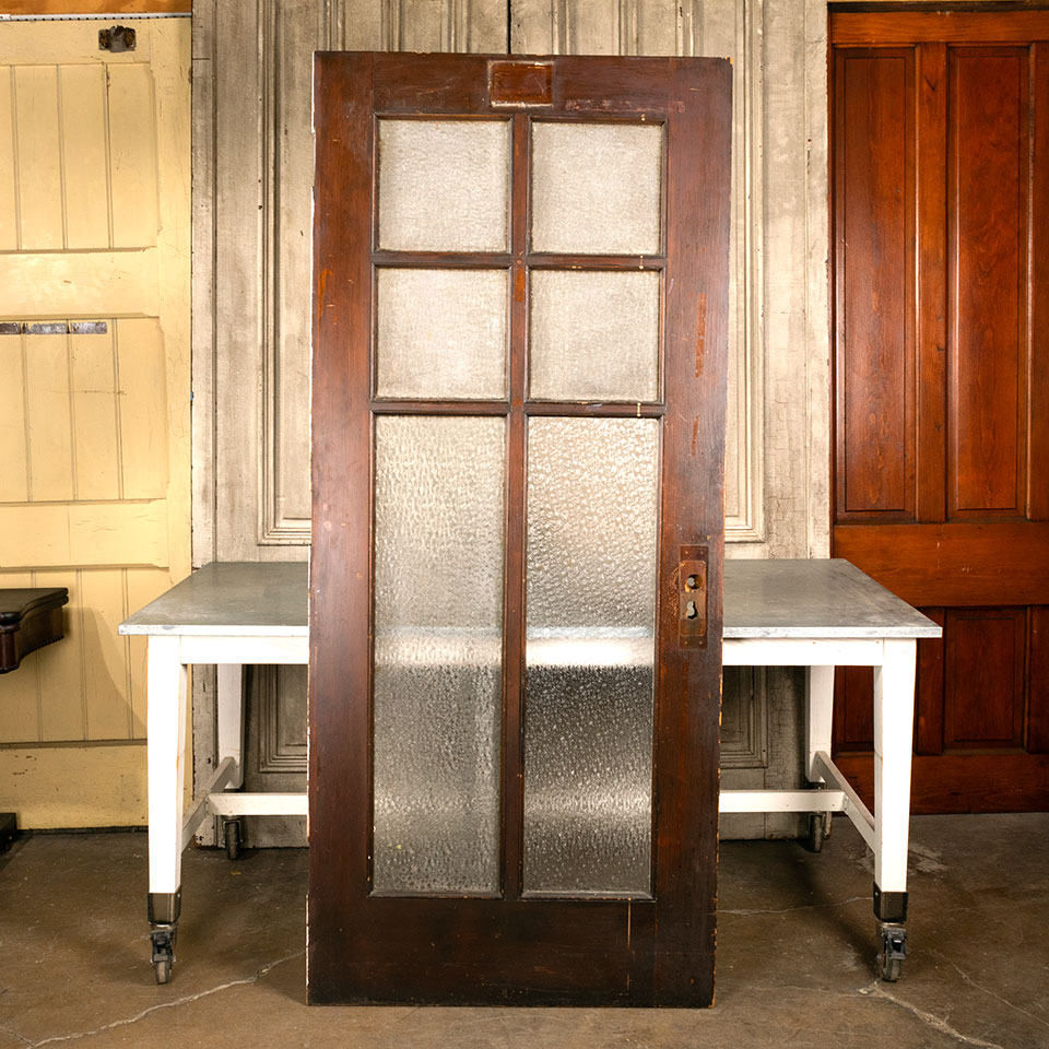 Antique architectural salvage 6 lite door with textured privacy glass measuring approx. 35 3/4" wide x 82 1/4" tall x 1 3/4" thick. See photos to evaluate condition.