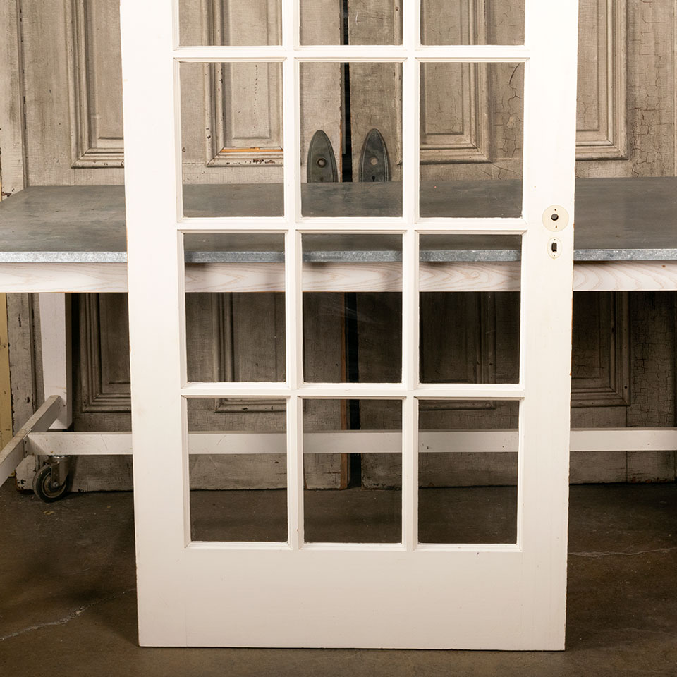 Architectural salvage 15 lite wood French entry door measuring approx. 35 1/2" wide x 79 3/8" tall x 1 3/4" thick. This door is painted on one side and natural on the other. There's wood missing at the top corner. See photos to evaluate condition.