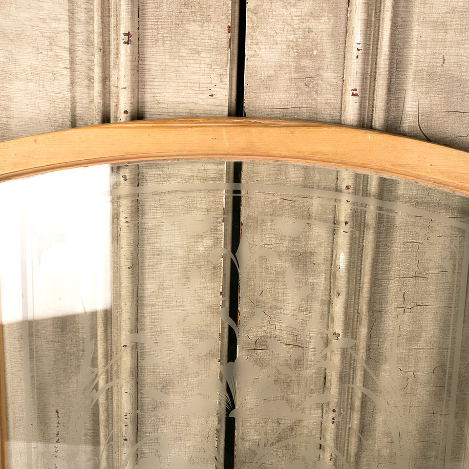 Antique architectural salvage 3-piece arched transom window with etched glass measuring approx. as follows: left panel 18 15/16" wide x 13" & 16" tall x 2" thick; middle panel 27 3/8" wide x 26 1/2" & 28 5/8" tall x 2" thick; right panel 18 15/16" wide x 13" & 16" tall x 2" thick. The etched glass appears to have been added at some point in the window's history. There's a chip in the bottom corner of the left panel. See photos to evaluate condition. Priced at $1,150 for the 3-piece set.