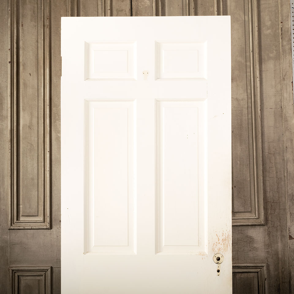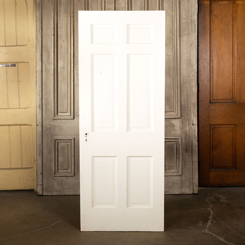 Antique architectural salvage painted wood 6 panel interior door measuring approx. 29 3/4" wide x 77 3/16" tall x 1 3/8" thick. See photos to evaluate condition.