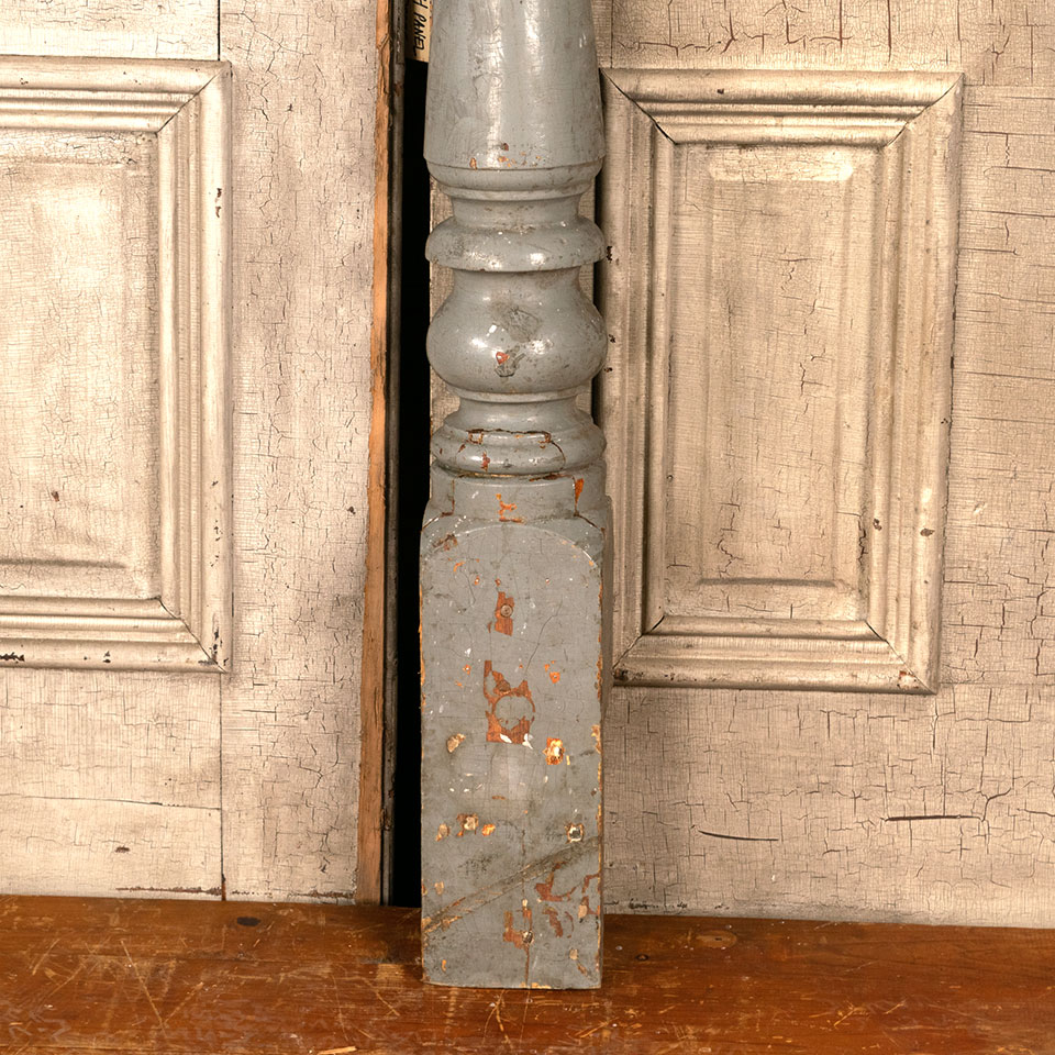 Antique architectural salvage turned wood staircase newel post measuring approx. 4 3/4" x 5" x 44 1/2" tall. The bottom of the post is notched. See photos to evaluate condition.