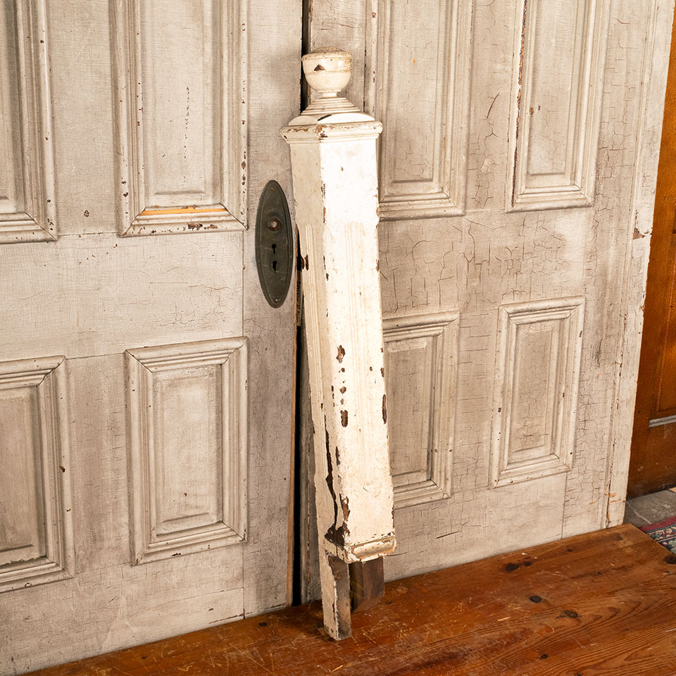 Antique architectural salvage wood staircase newel post with turned finial measuring approx. 6" wide x 46 3/4" tall with a 4 3/4" square base. The bottom of the post is notched and there's a split on one side. See photos to evaluate condition.