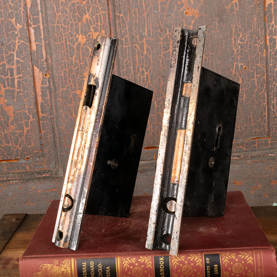 Antique architectural salvage pocket door hardware pulls and locks set. The set includes 4 cast bronze pulls with a japanned finish (approx. 2 3/4" wide x 8" tall with a 1 3/4" wide x 4 1/2" tall recessed area), 2 mortise locks with pop-out finger pulls (faceplates: 1 1/4" wide x 7 5/8" tall; mortise bodies: 5/8" wide x 5 1/4" tall one with a 3 3/4" overall back set and the other with a 3 3/8" overall backset). See photos to evaluate condition. Sold as set. Priced at $450 for the 6 piece set.