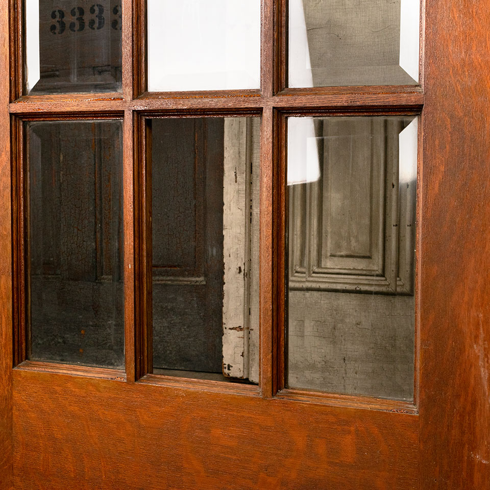 Pair of antique architectural salvage 15 lite oak French doors with beveled glass panes together measuring approx. 60 3/8" wide x 83 5/8" tall x 1 3/4" thick. The stile and rail at the top of one door are not aligned. A piece of wood has been added to the bottom of the doors. The bottom middle pane on one door is missing glass. See photos to evaluate condition. Priced at 3,500 for the pair.