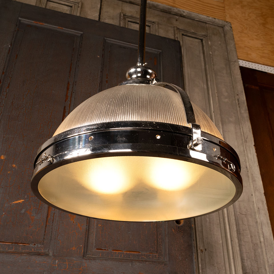 Architectural salvage contemporary industrial style pendant light fixture with chrome finish measuring approx. 14" in diameter x 29" tall. This is not an antique light fixture. See photos to evaluate condition.