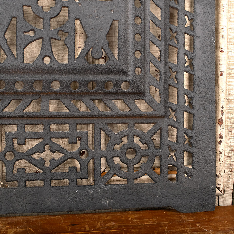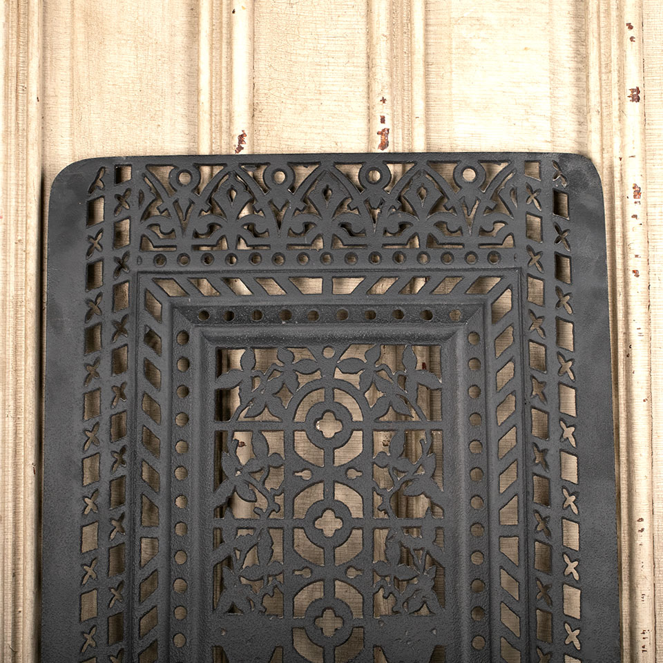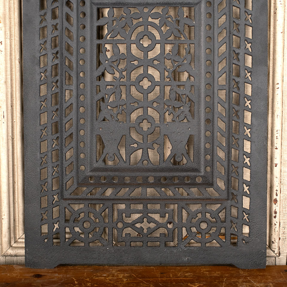 Antique architectural salvage cast iron fireplace summer front cover with floral motif measuring approx. 20" wide x 28 7/16" tall x 1 3/4" front to back. See photos to evaluate condition.