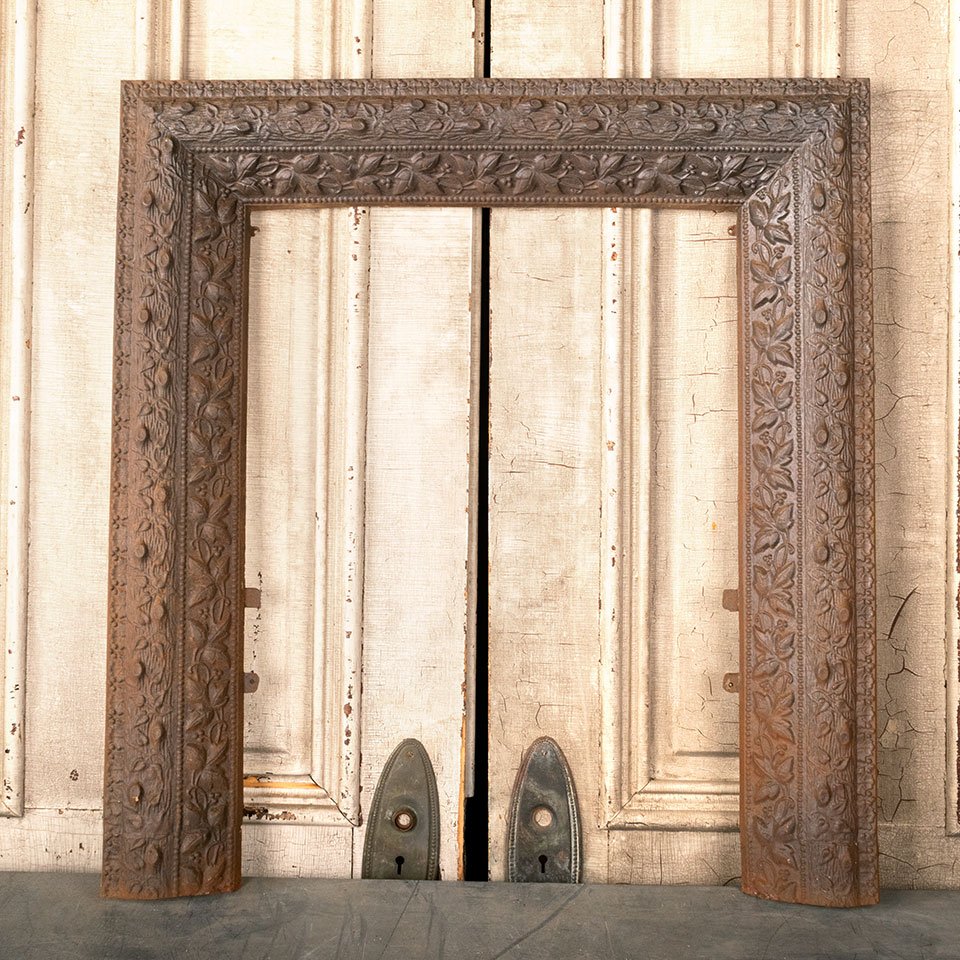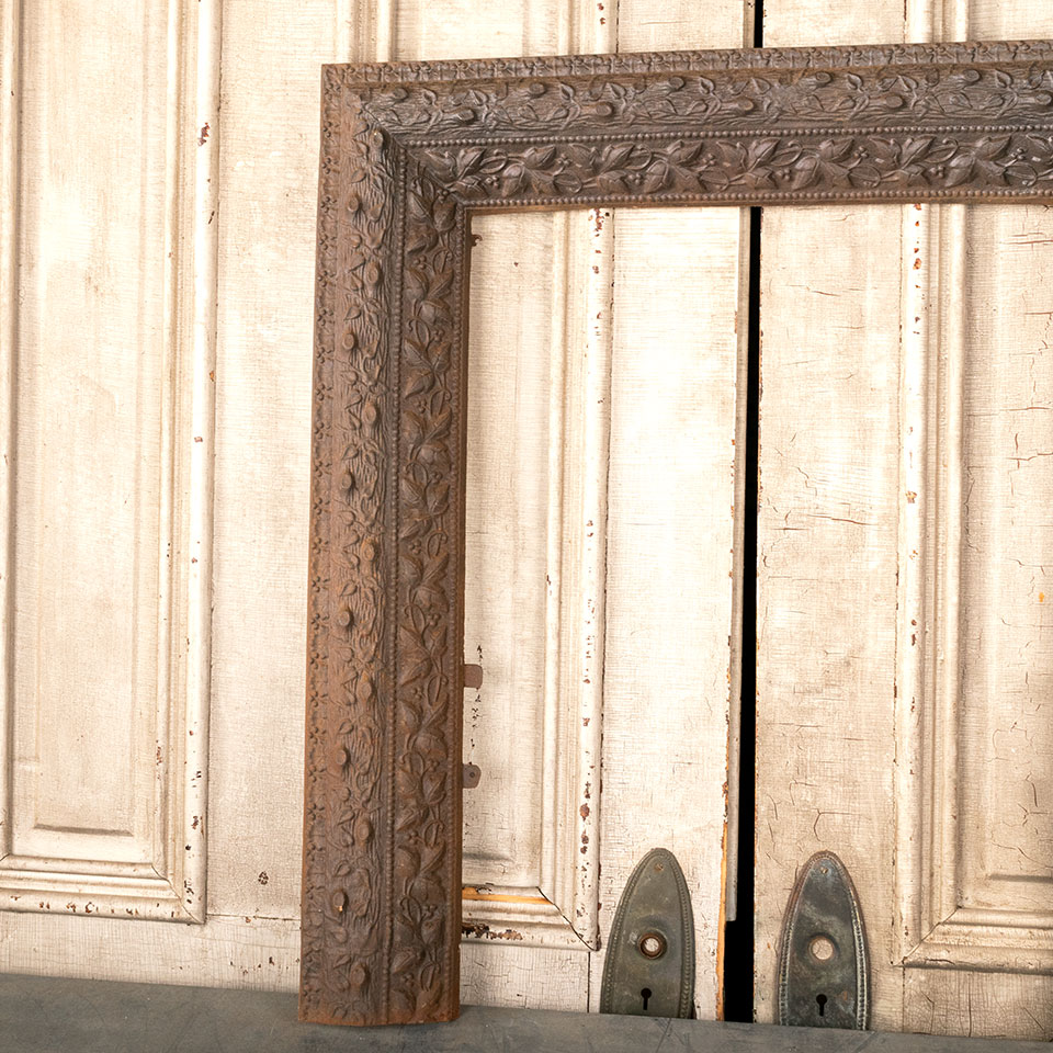 Antique architectural salvage cast iron fireplace surround with floral motif measuring approx. 30 1/8" wide x 32 1/2" tall x 3 1/4" front to back. The interior firebox opening measures approx. 19 15/16" wide x 27 7/16" tall. See photos to evaluate condition.