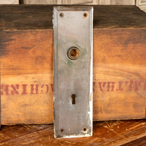 Antique architectural salvage bronze entry door backplate hardware with a beveled border and skeleton keyhole measuring approx. 3" wide x 10" tall with a 3/4" diameter collar. The spindle and keyhole measure 3 3/4" on center. See photos to evaluate condition.