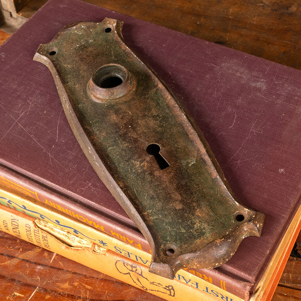 Antique architectural salvage metal doorknob backplate door hardware measuring approx. 2 1/2" wide x 7 3/4" tall with a 7/8" diameter collar. The spindle and keyhole measure 2 1/2" on center. See photos to evaluate condition.
