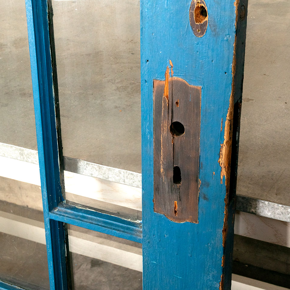 Antique architectural salvage large wood door with arched divided lite window measuring approx. 41" wide x 103 3/8" tall x 1 5/8" thick. At some point in the door's history a 3/8" piece of wood was added to the hinged side of the door and a piece of trim along the top on one side of the door. See photos to evaluate condition.