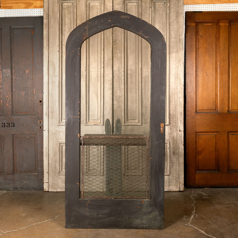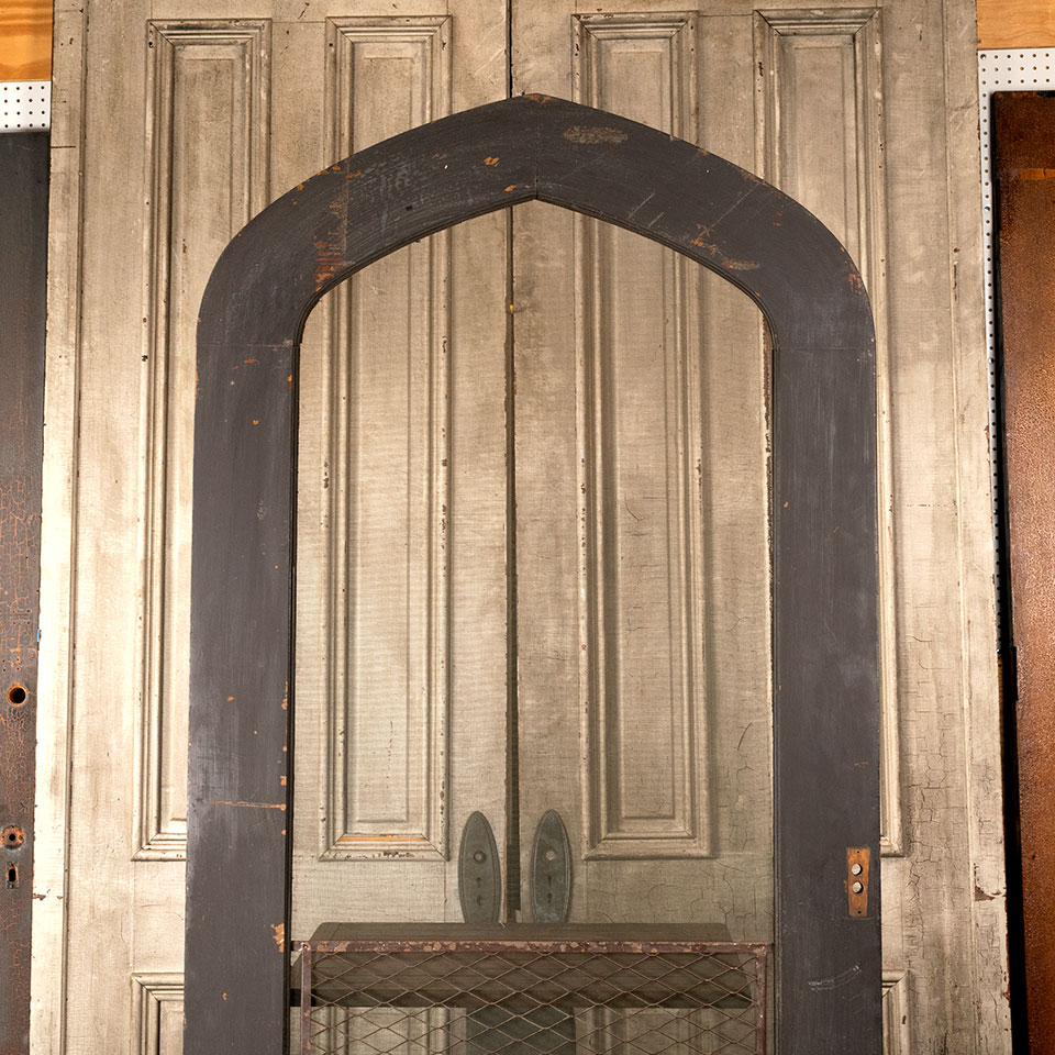 Vintage antique architectural salvage painted oak pointed arch screen door measuring approx. 38 7/8" wide x 84 1/2" tall x 1 1/2" thick. See photos to evaluate condition.
