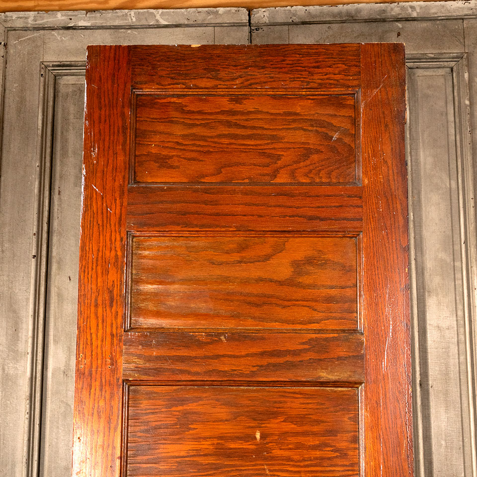Antique architectural salvage horizontal 6 panel oak interior door measuring approx. 29 3/4" wide x 89 1/4" tall x 1 3/4" thick. The veneer has buckled on both sides of the second panel from the top. See photos to evaluate condition.