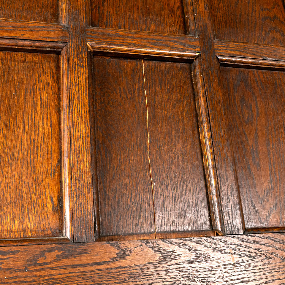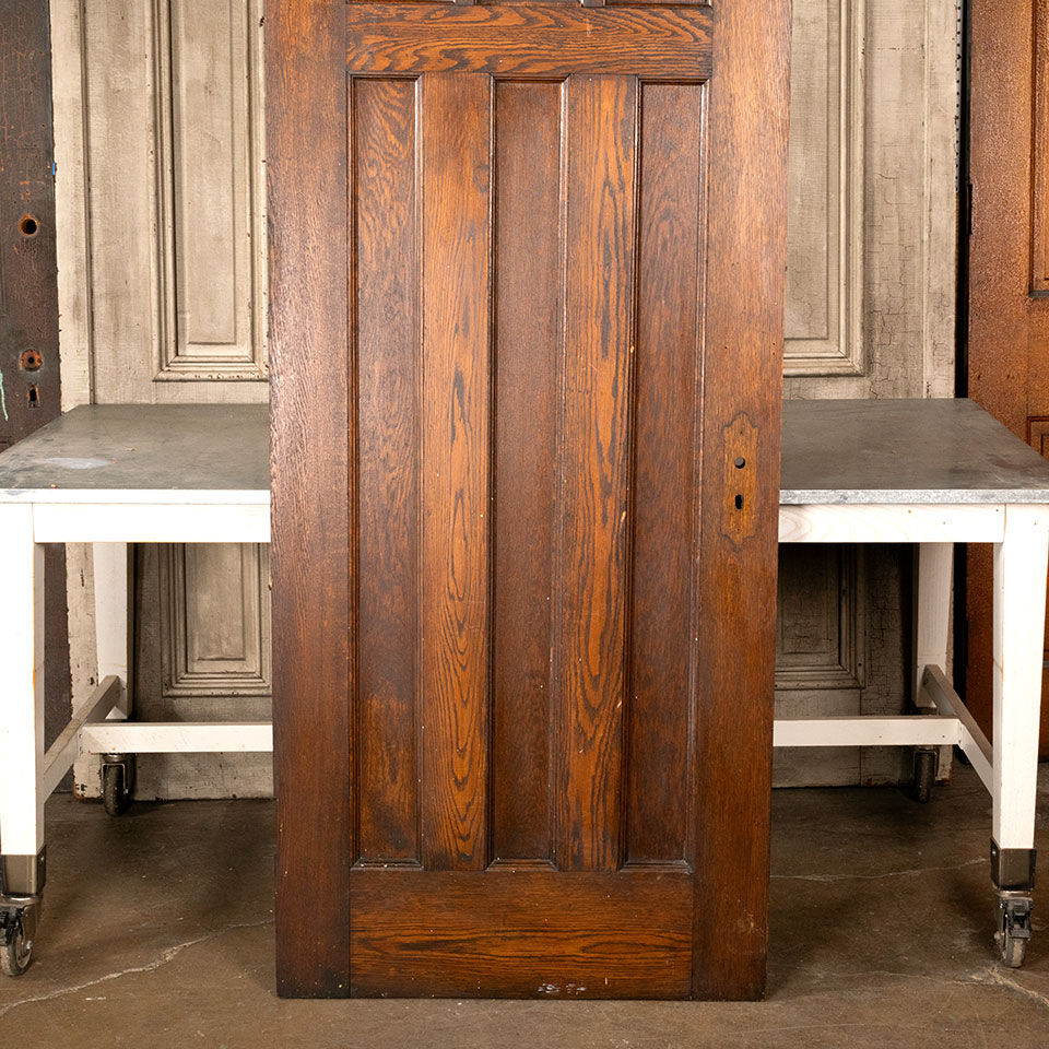 Antique architectural salvage oak three panel interior door with 6 faux lites at the top measuring approx. 31 1/2" wide x 89 3/4" tall x 1 3/4" thick. The lower center faux lite panel is split and a piece of stop molding is missing. See photos to evaluate condition.