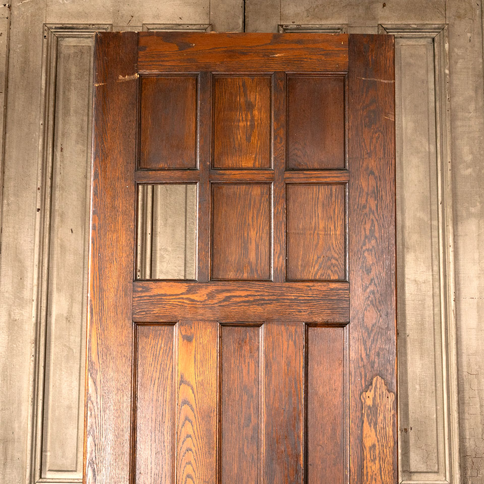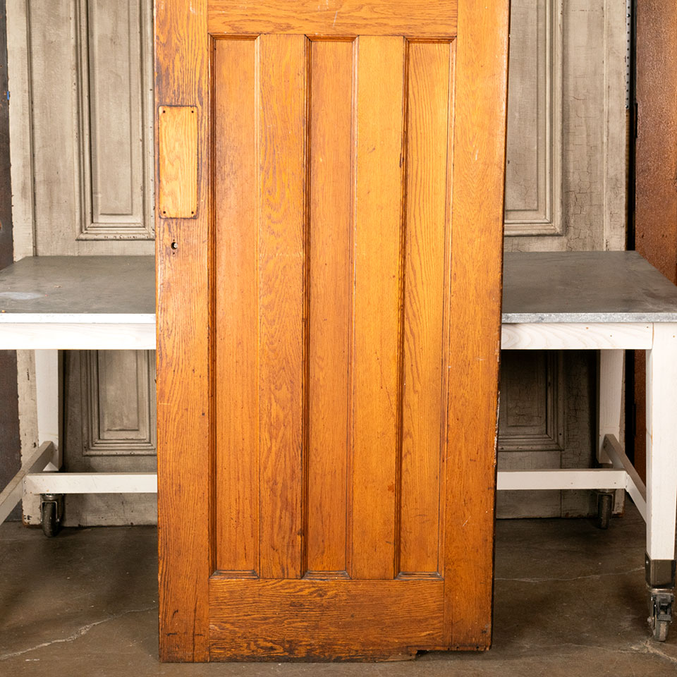 Antique architectural salvage interior oak three panel swinging door with 6 faux lites at the top measuring approx. 31 3/4" wide x 88 1/2" tall x 1 3/4" thick. One of the faux lite panels and its stop molding pieces are missing. See photos to evaluate condition.