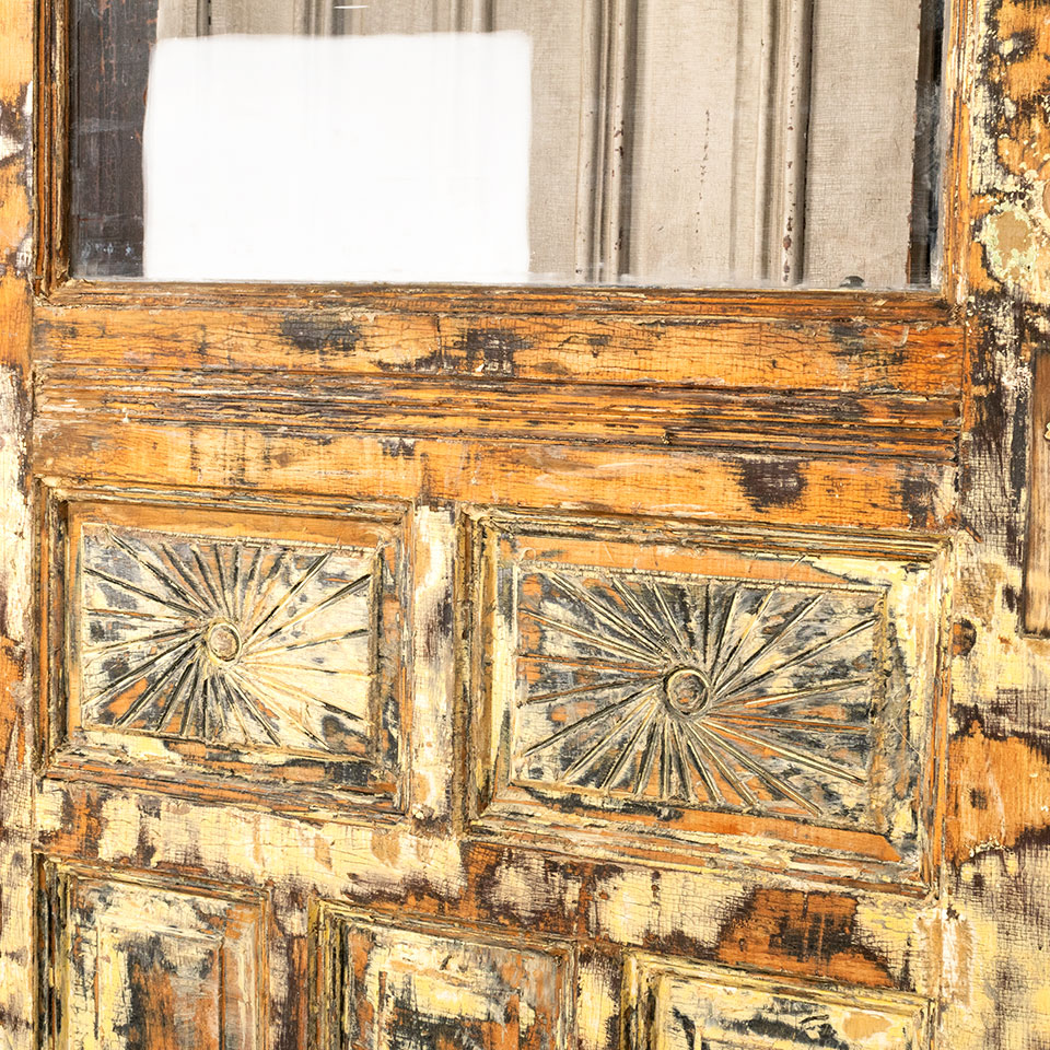 Antique architectural salvage Victorian half-lite wood entry door with wavy glass measuring approx. 31 7/8" wide x 79 3/8" tall x 1 3/8" thick. Some of the paint has been removed from the exterior side and the interior side is natural. See photos to evaluate condition.