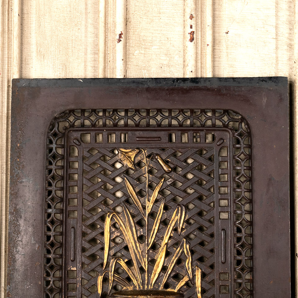 Antique architectural salvage ornate cast iron fireplace summer front cover with flower and urn in high relief measuring approx. 19 7/8" wide x 25 7/8" tall x 3/4" front to back. See photos to evaluate condition.